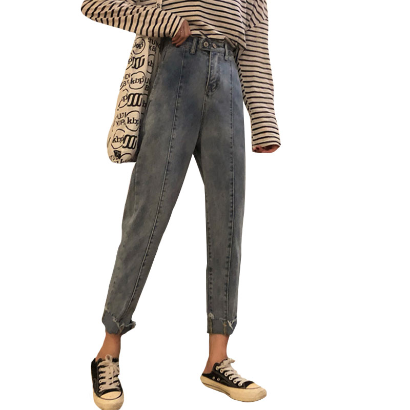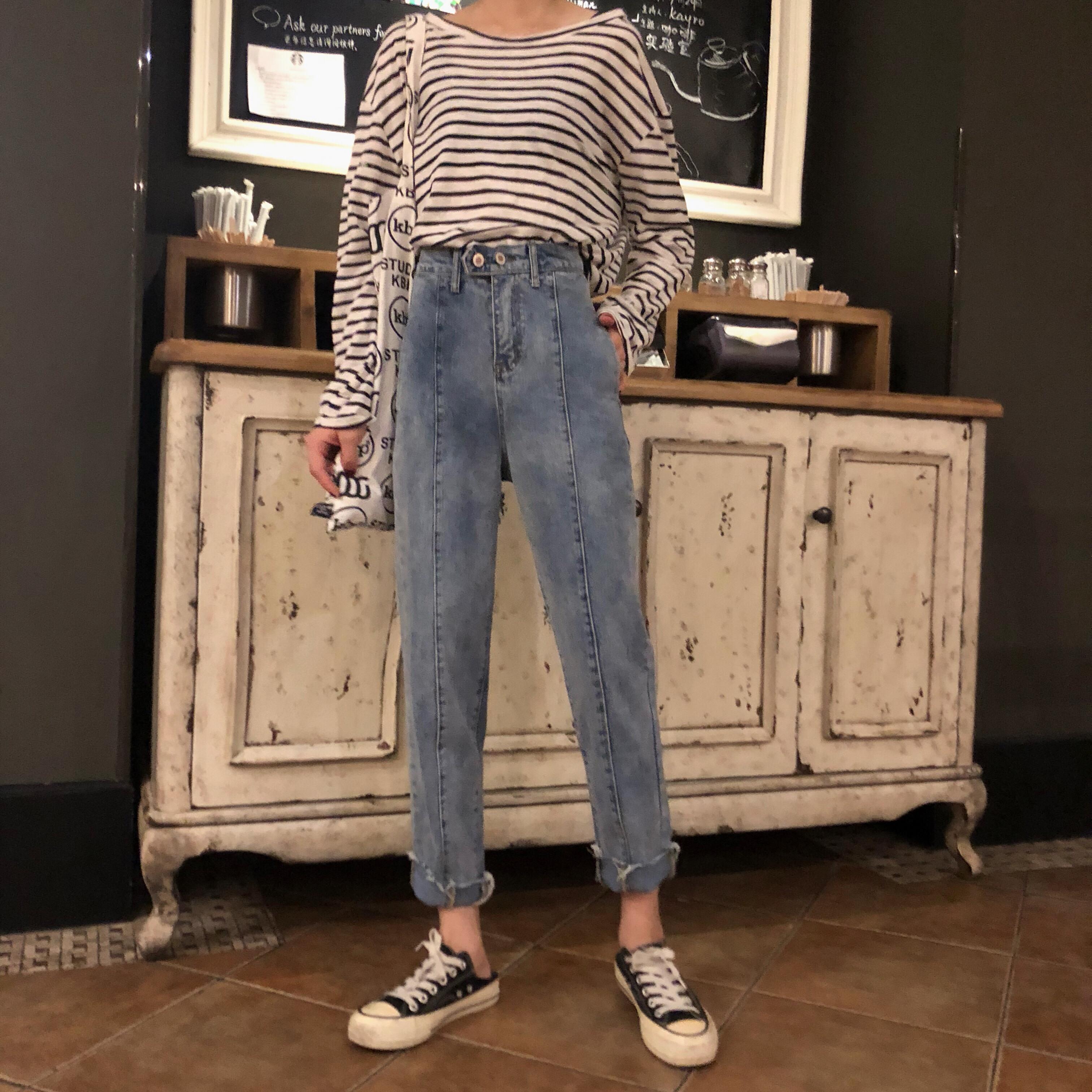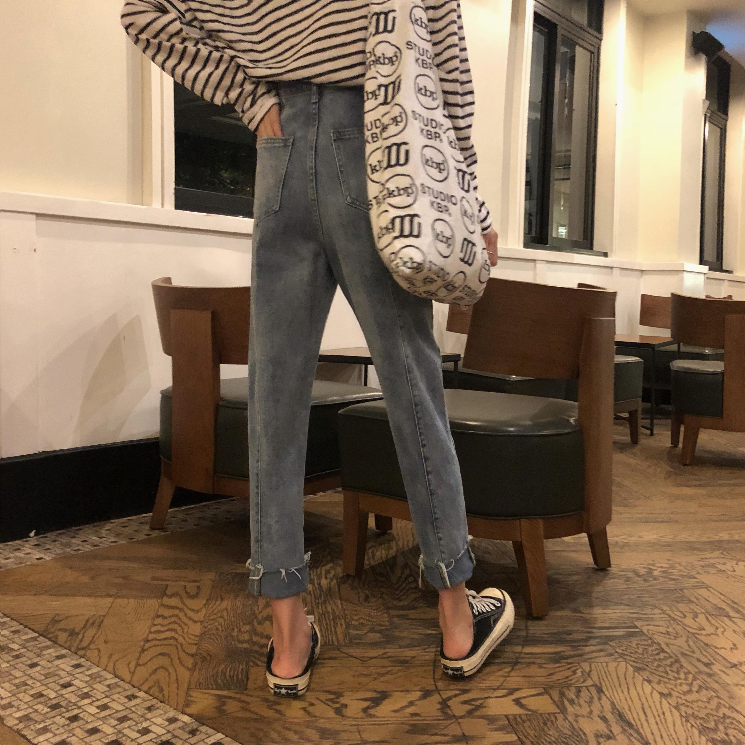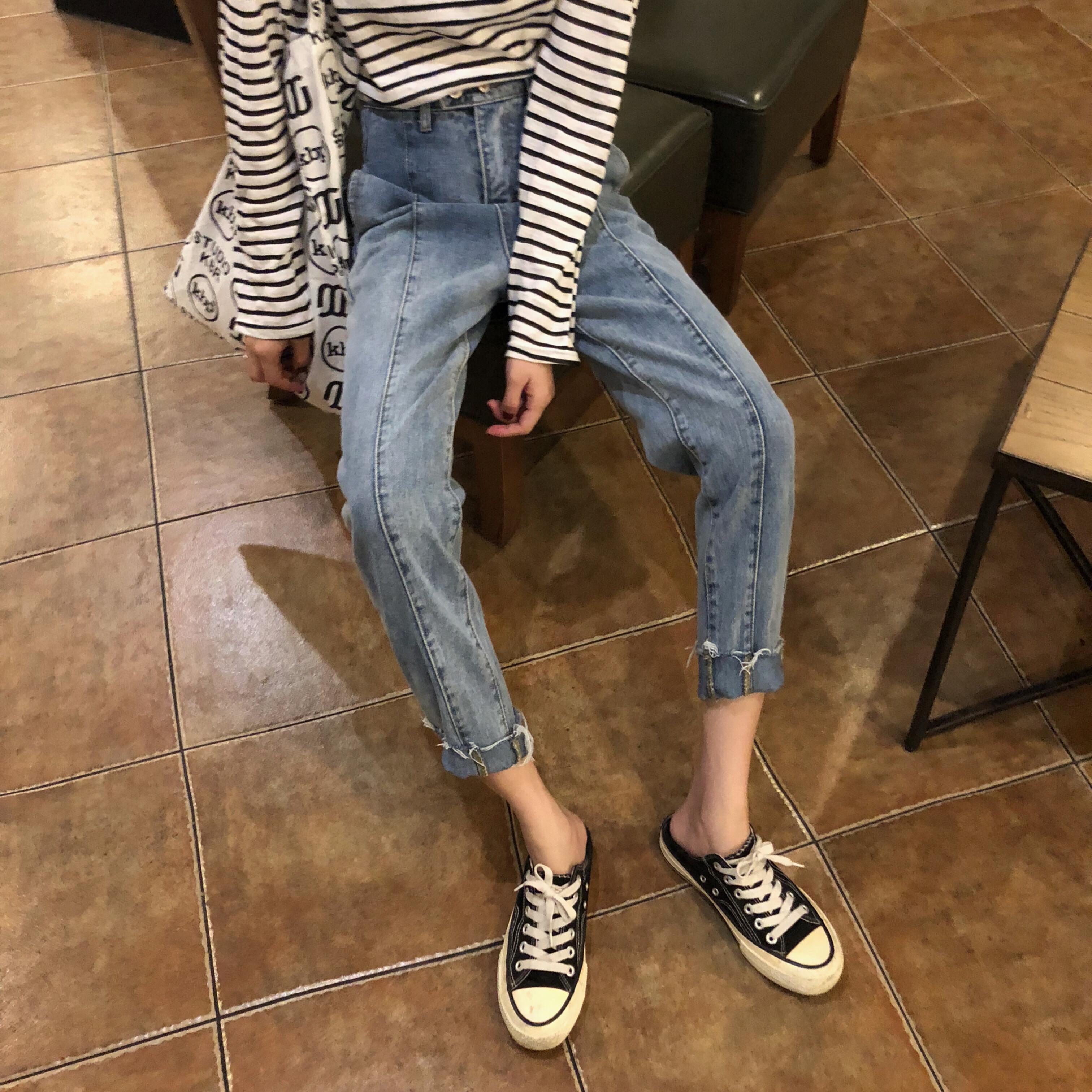 / 秋季女裝韓版水洗做舊牛仔褲時尚高腰顯瘦個性拼接直筒褲九分褲潮