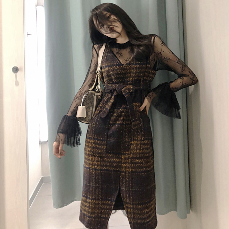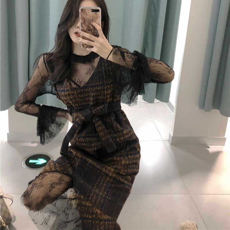 / 御姐套裝女秋冬新款復古格子毛呢連衣裙學生喇叭長袖網紗打底上衣
