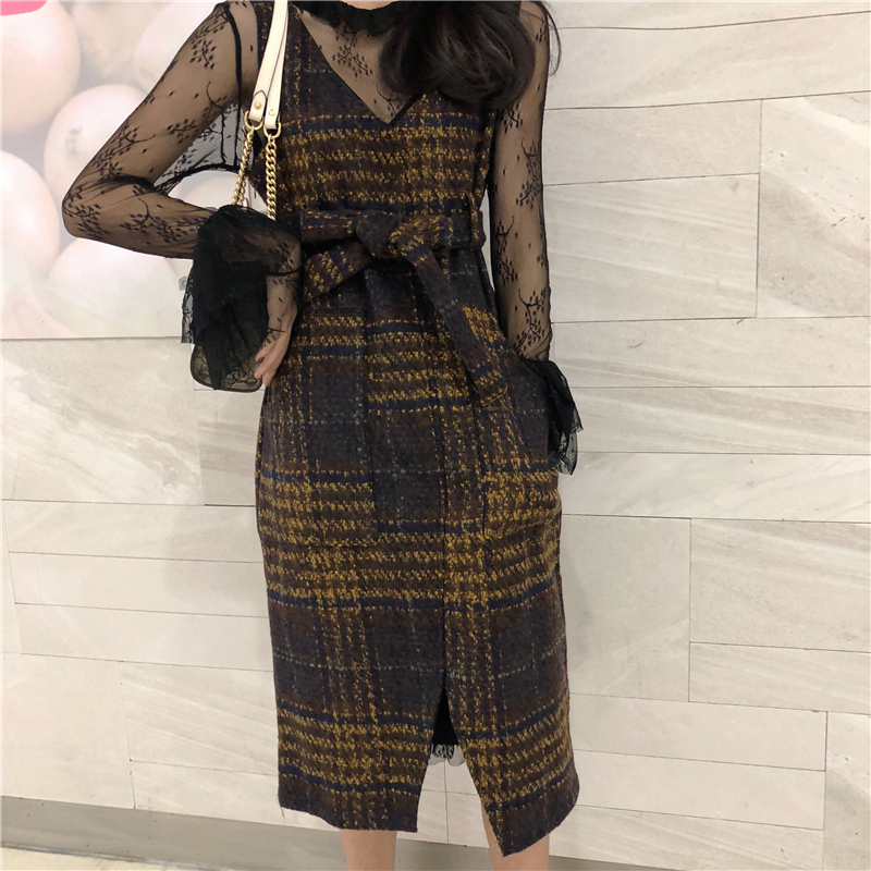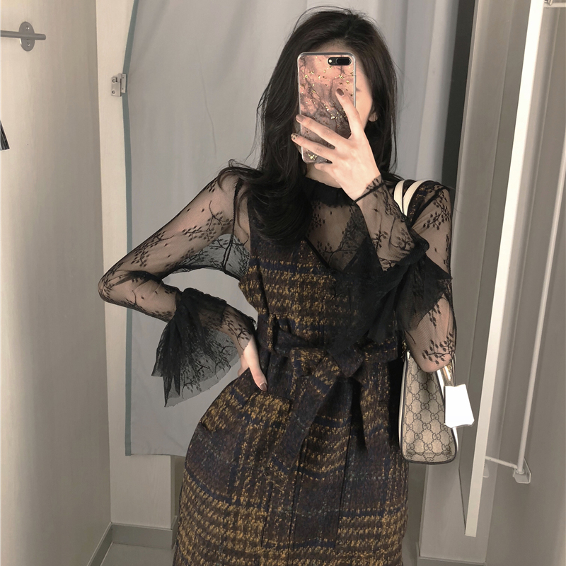 御姐套裝女秋冬新款復古格子毛呢連衣裙學生喇叭長袖網紗打底上衣