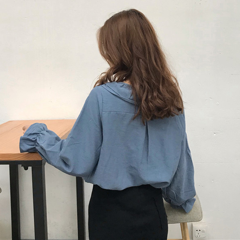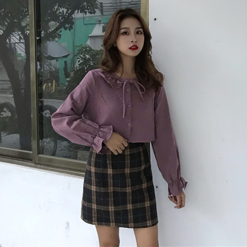 / 燈芯絨襯衣女秋冬裝2018新款韓版時尚百搭寬松荷葉領喇叭長袖襯衫
