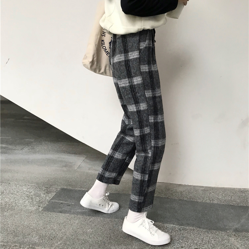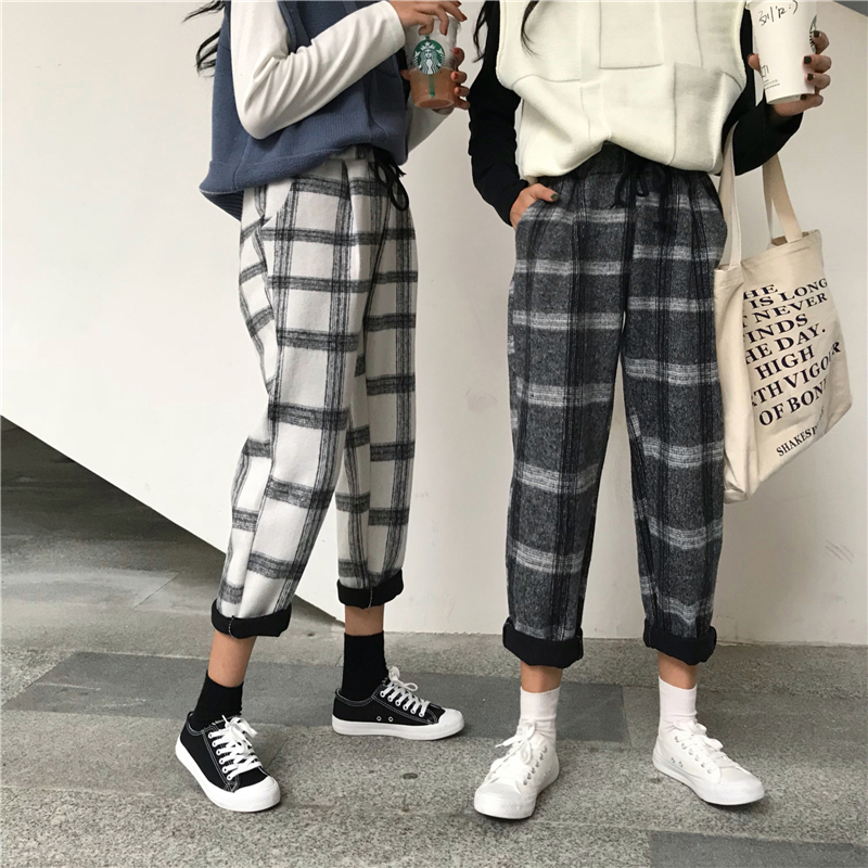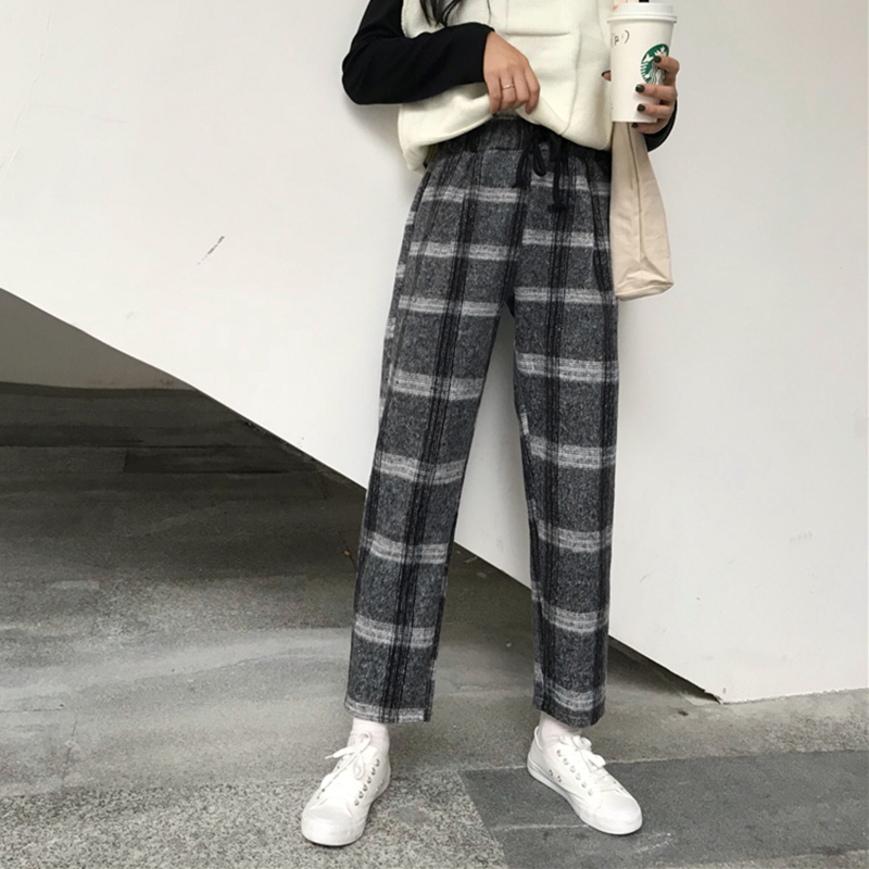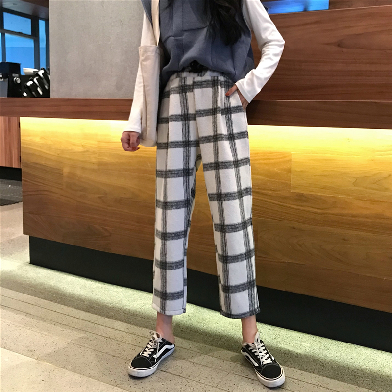 / 毛呢休閑褲女秋冬裝2018新款韓版學生松緊高腰格子寬松九分哈倫褲