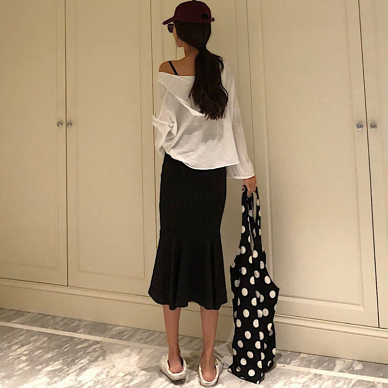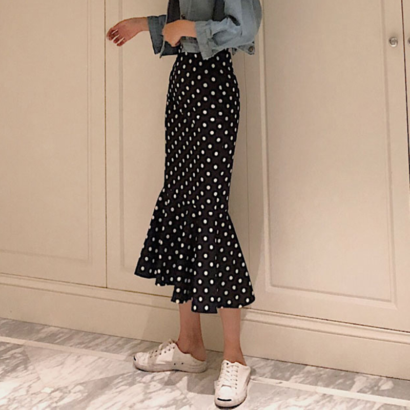 / 復古風波點高腰顯瘦半身裙子女秋冬裝新款韓版學生黑色魚尾中長裙