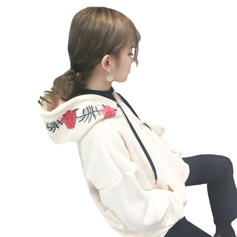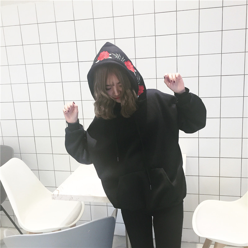 / 秋冬韓版學院風寬松連帽玫瑰刺繡加絨加厚套頭超火衛衣上衣外套女