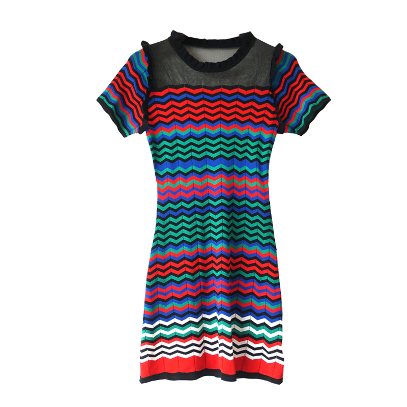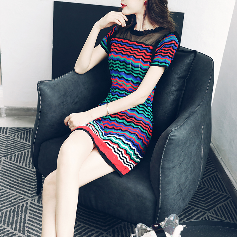 / S秀2018夏季新款淑女氣質拼接高腰顯瘦連衣裙女短袖時尚A字裙子潮