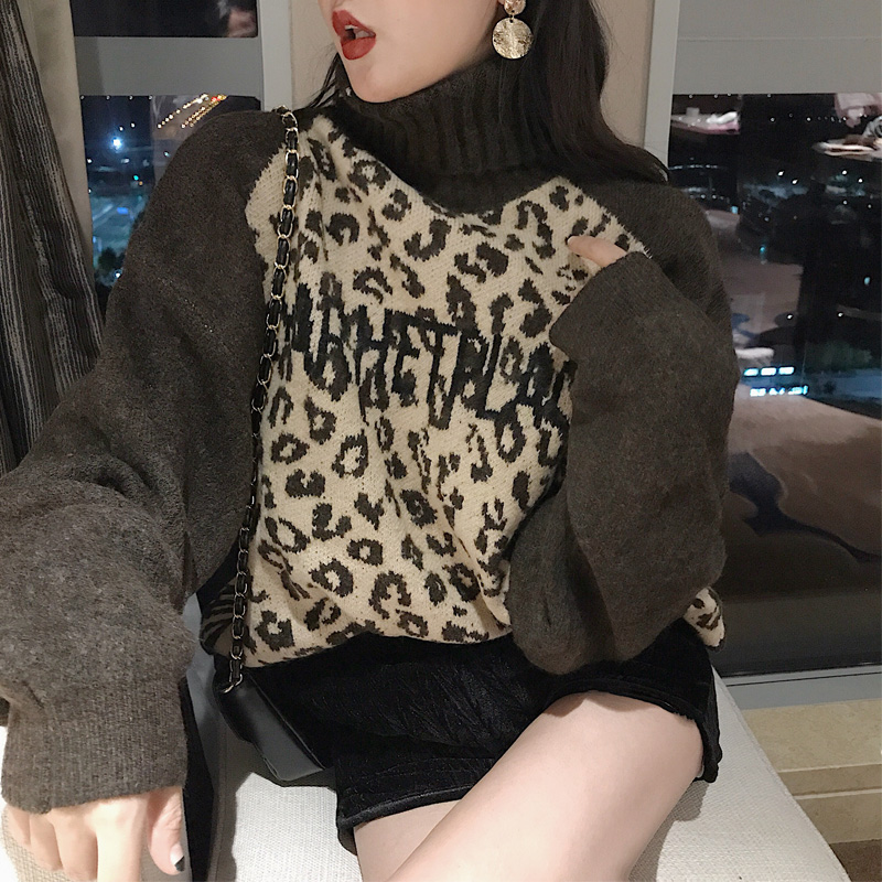 / 慵懶風套頭毛衣女2018新款秋冬韓版高領豹紋拼接長袖寬松針織衫潮