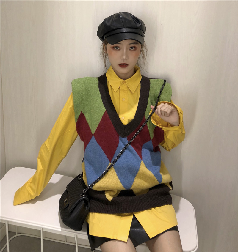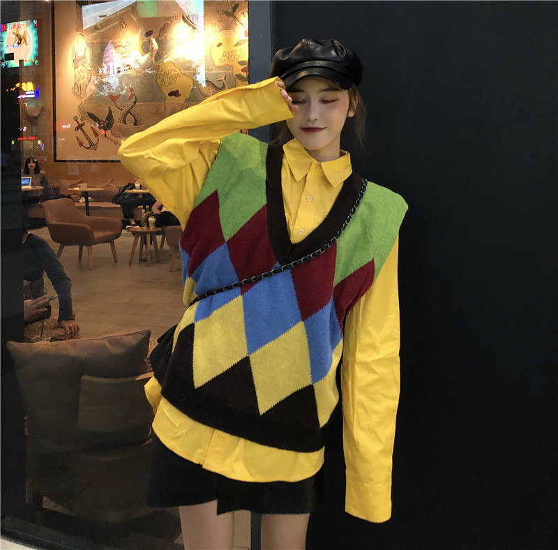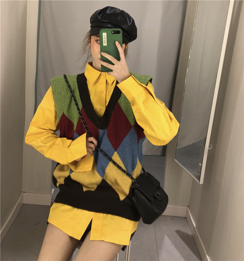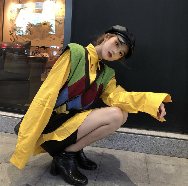 / 港味新款韓版chic百搭中長款襯衣時尚套裝撞色針織毛衣馬甲兩件套