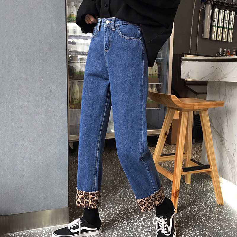 2018秋冬新款韓版女裝學生腰拼色豹紋直筒褲牛仔卷邊九分闊腿褲子