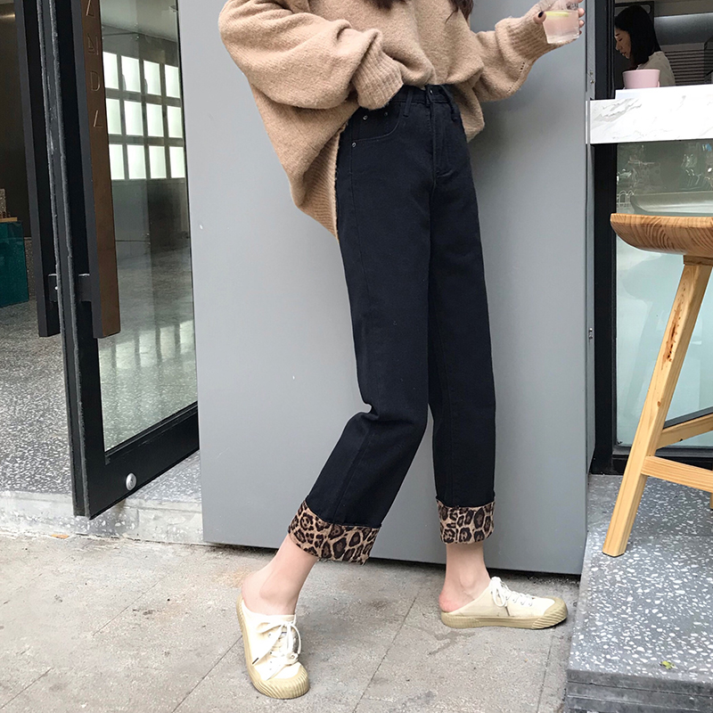 / 2018秋冬新款韓版女裝學生腰拼色豹紋直筒褲牛仔卷邊九分闊腿褲子