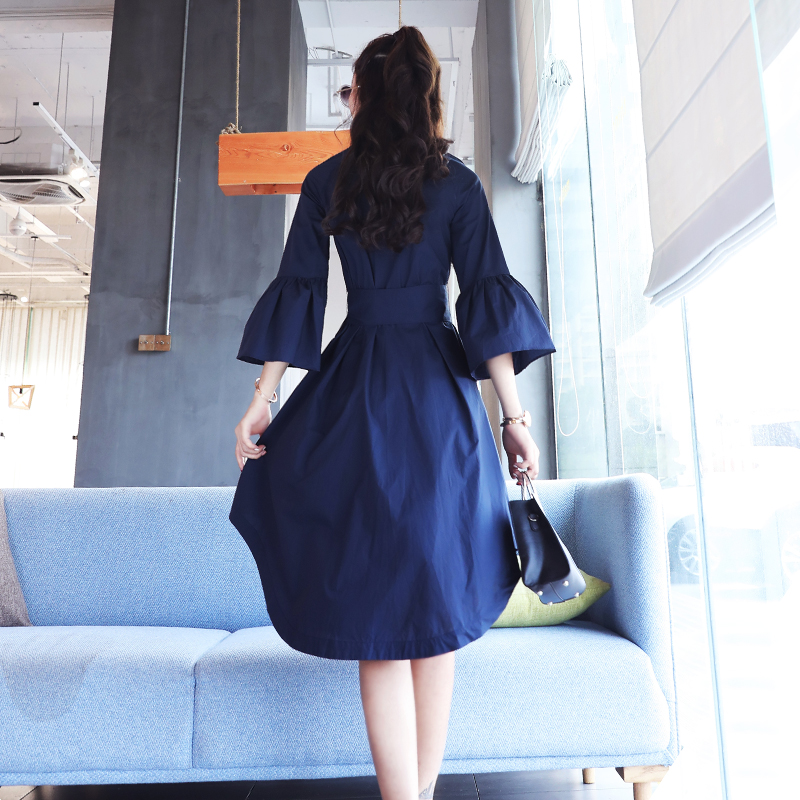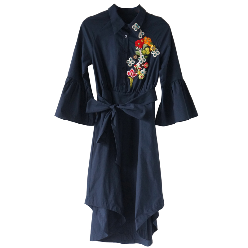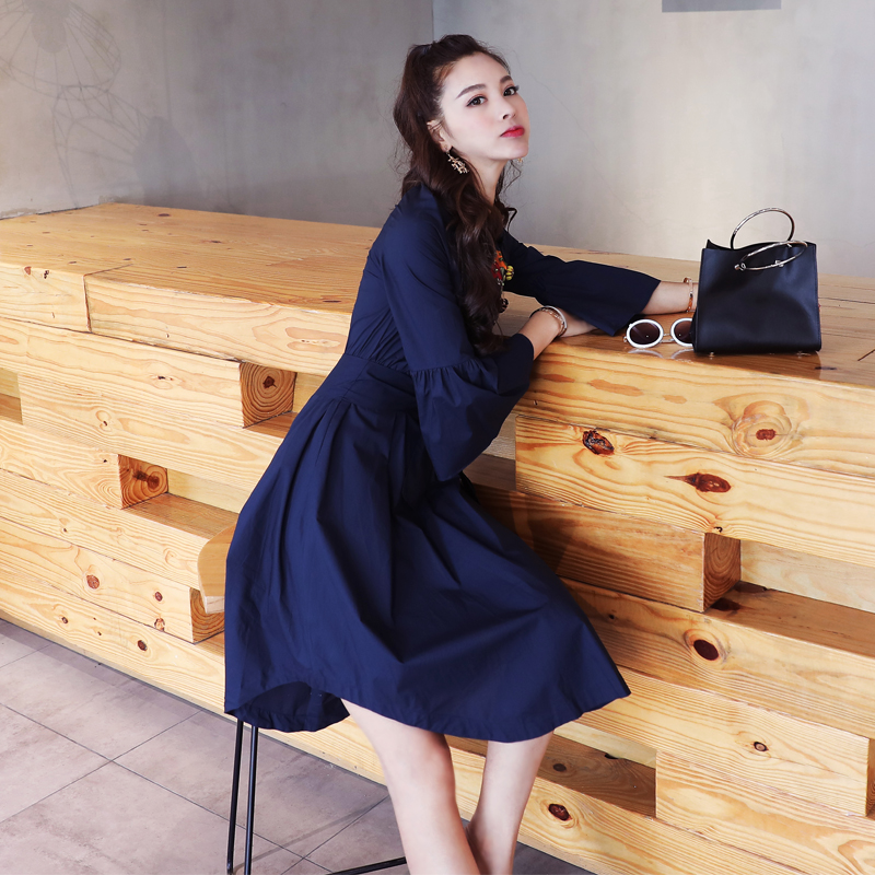 / 名媛氣質2018春季外套新品淑女修身顯瘦藏藍色繡花連衣裙