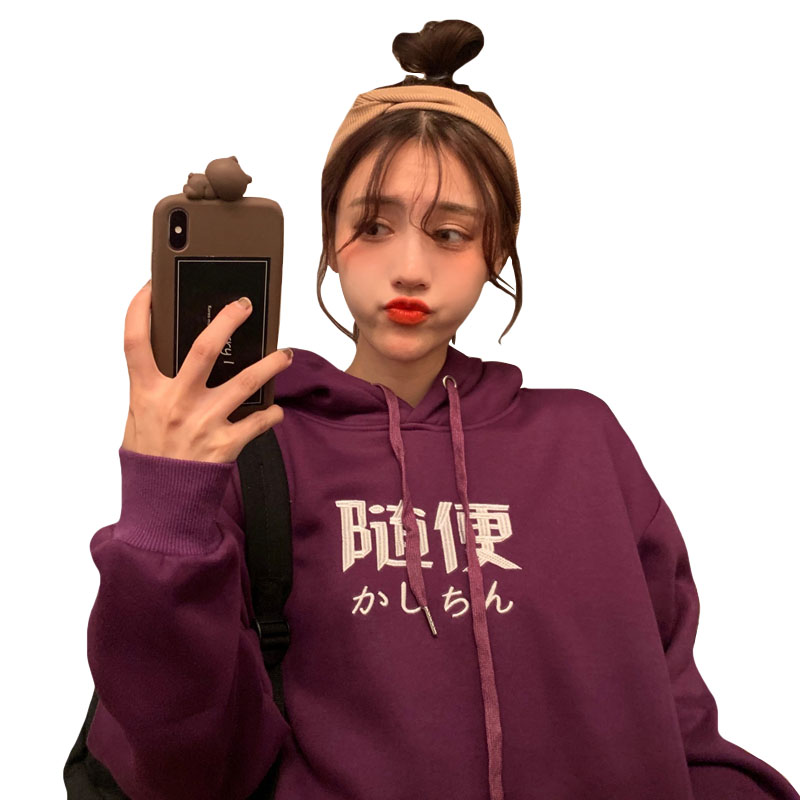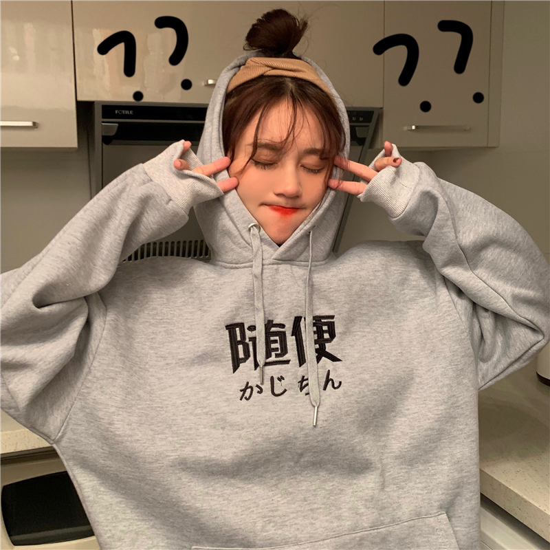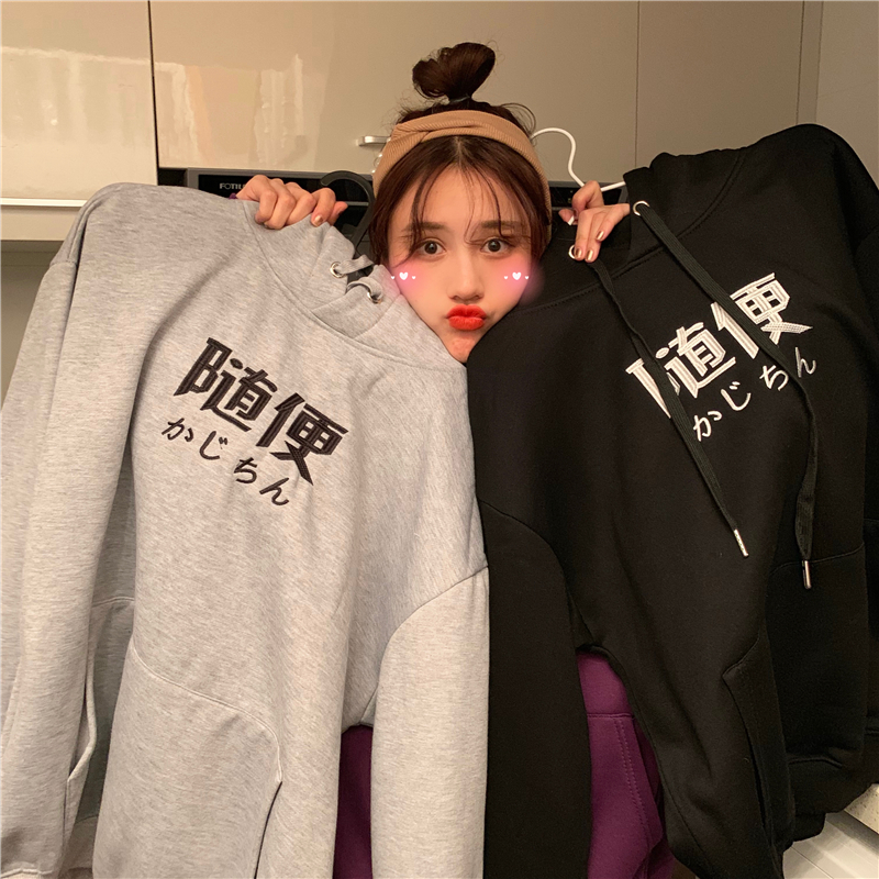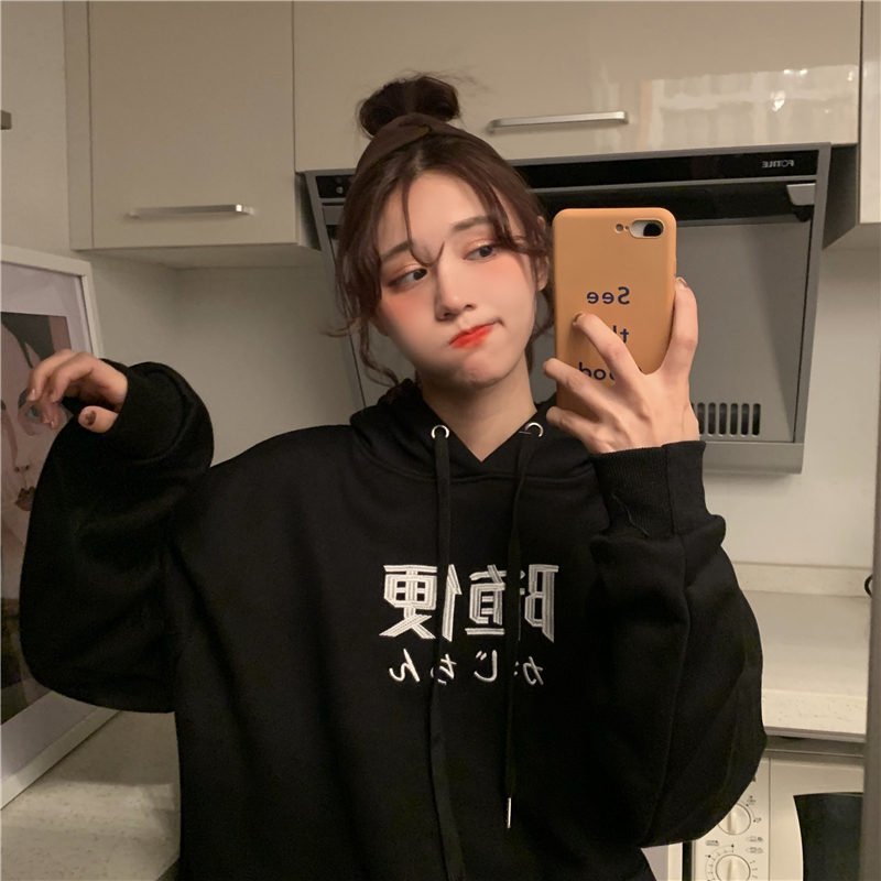 秋冬韓版chic原宿風文字刺繡加絨加厚寬松連帽套頭衛衣上衣外套女