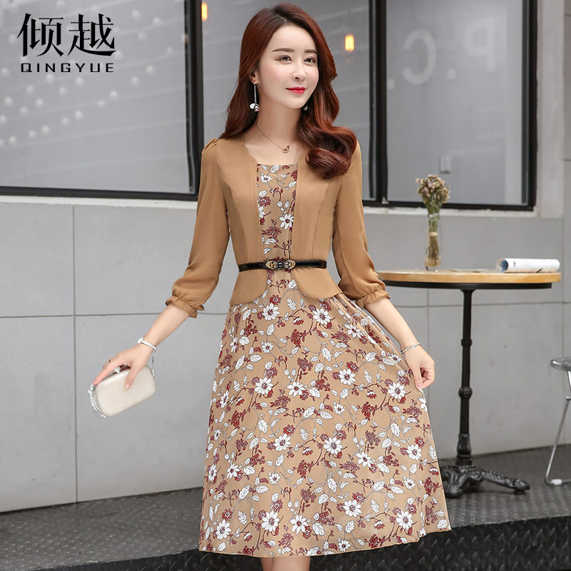 傾越2017春裝新款女裝氣質假兩件針織雪紡連衣裙女長袖碎花打底裙