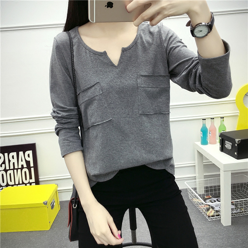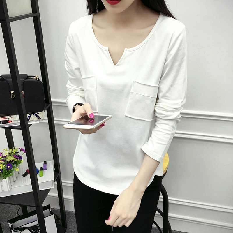 / 秋裝新款純色棉長袖T恤女打底衫V領寬松大碼顯瘦打底衫女潮