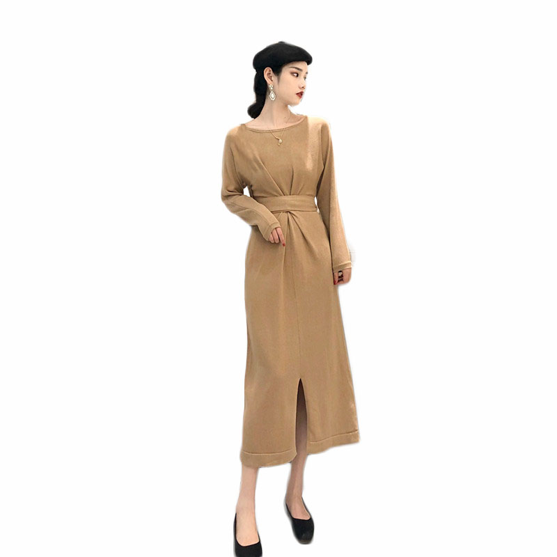 / 韓國復古風連衣裙女秋冬2018新款百搭收腰綁帶修身顯瘦長款針織衫