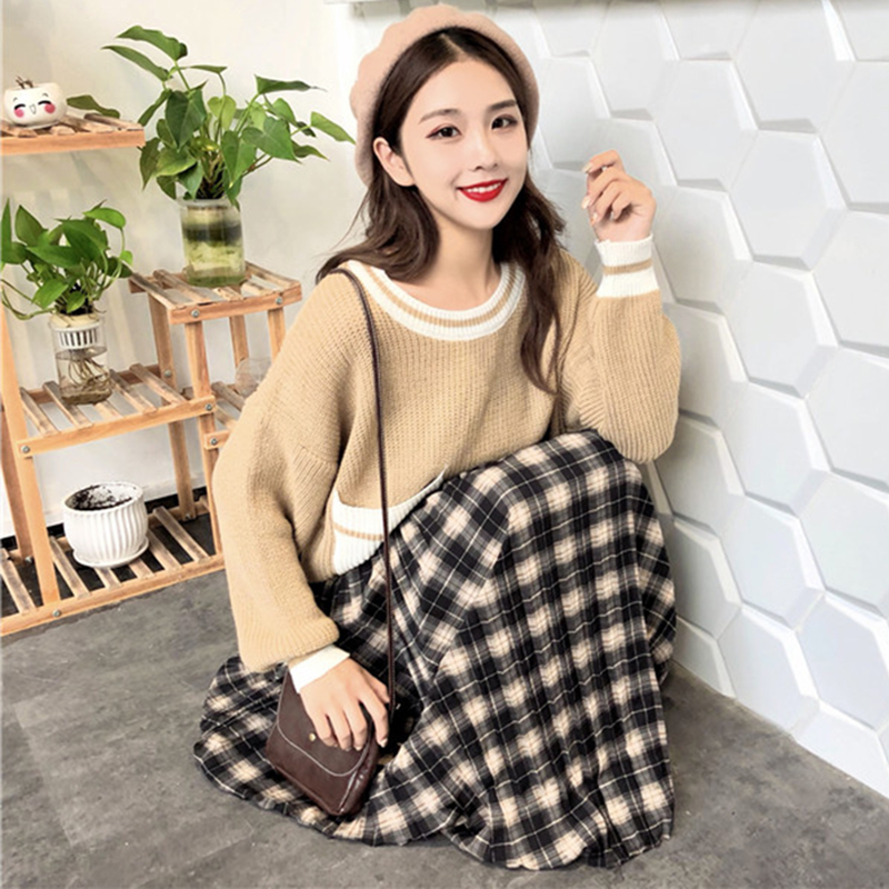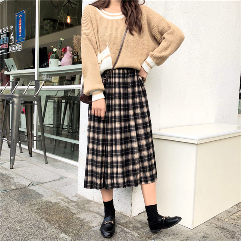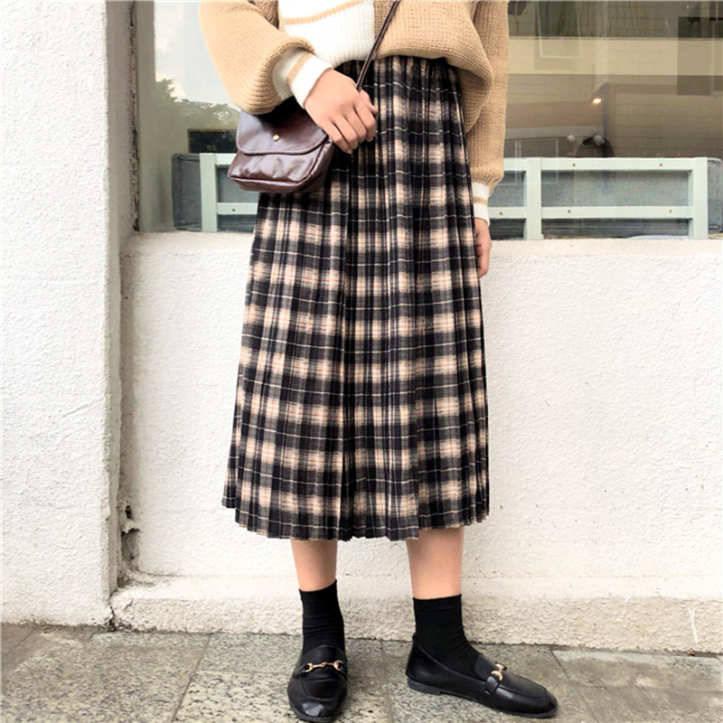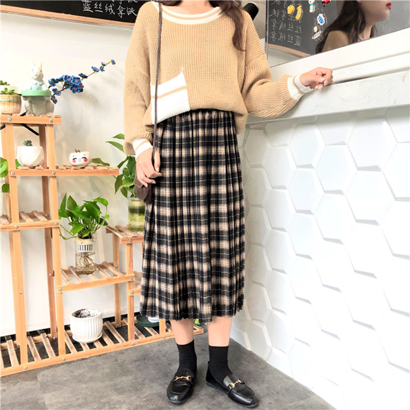 / 格子百褶半身裙女秋裝新款韓版洋氣高腰中長裙學生休閑清新A字裙