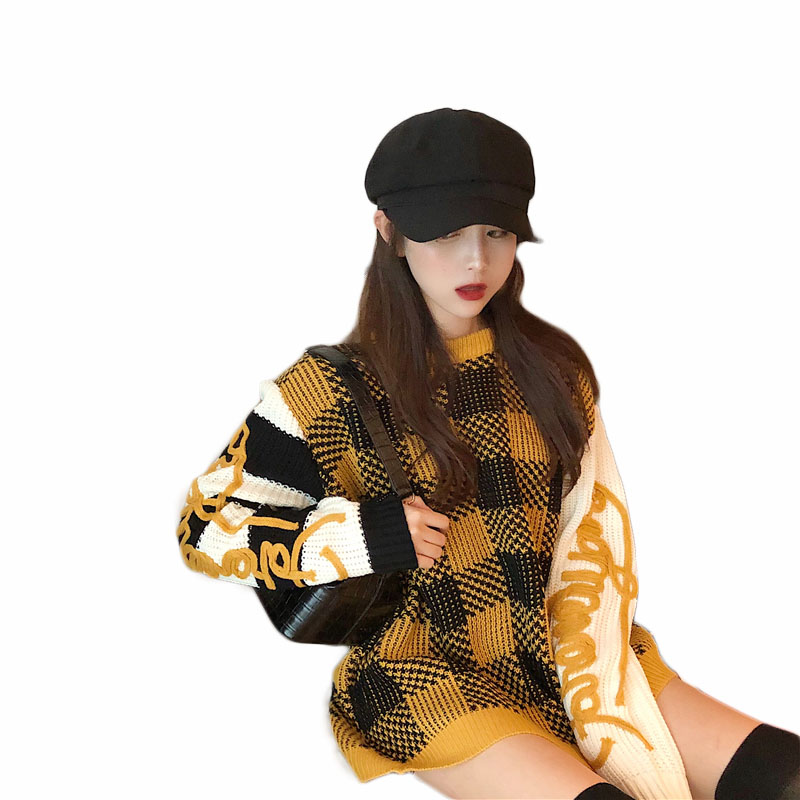格子時尚網紅毛衣女秋冬2018新款寬松慵懶風外穿毛線衣套頭上衣潮