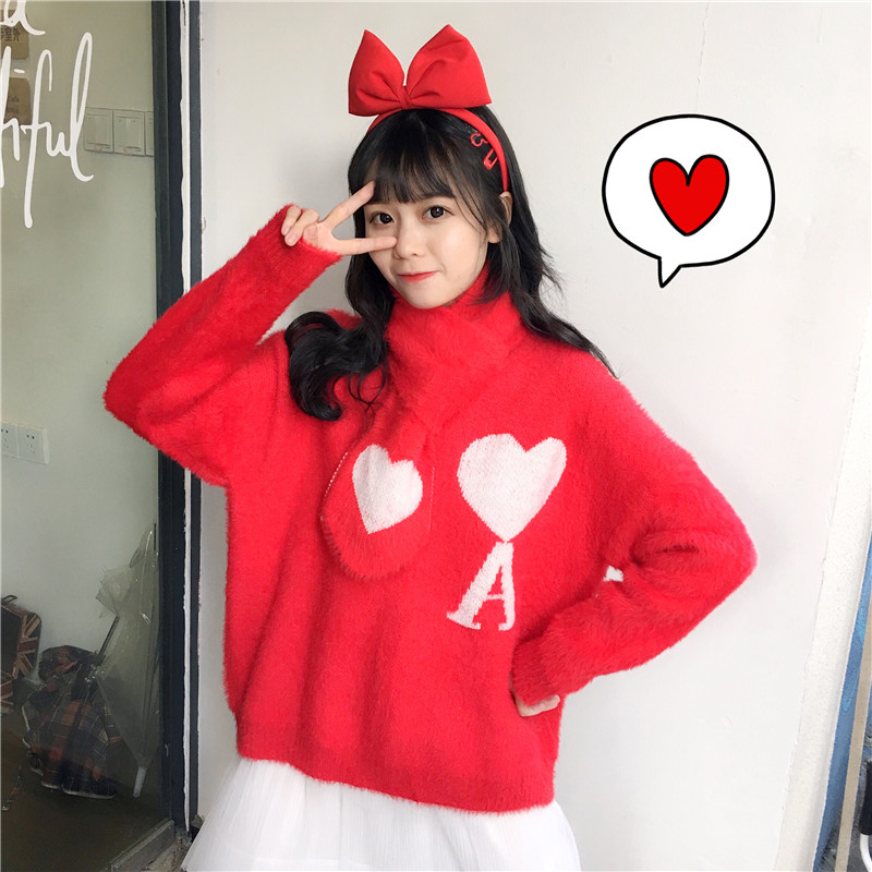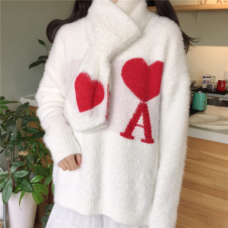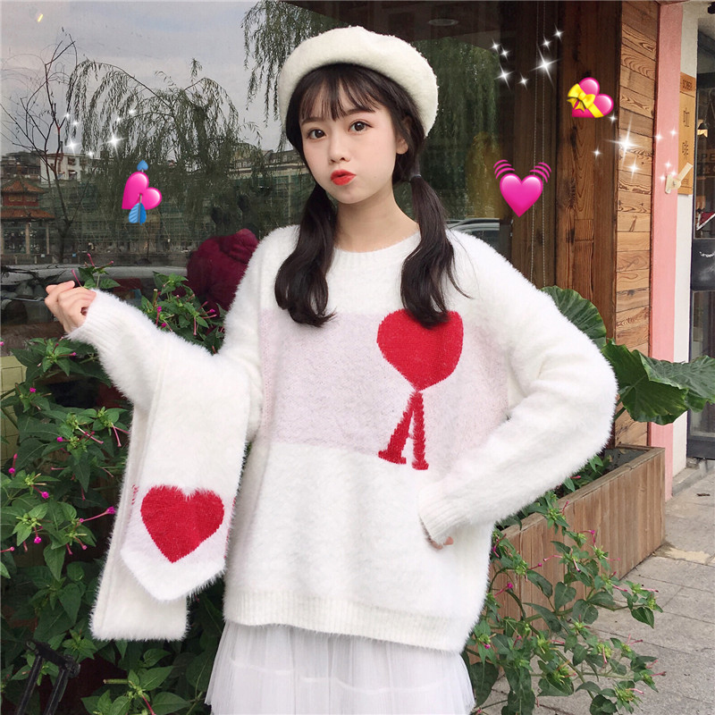 / 毛衣配裙子兩件套秋冬裝新款愛心提花長袖針織衫高腰顯瘦A字蛋糕