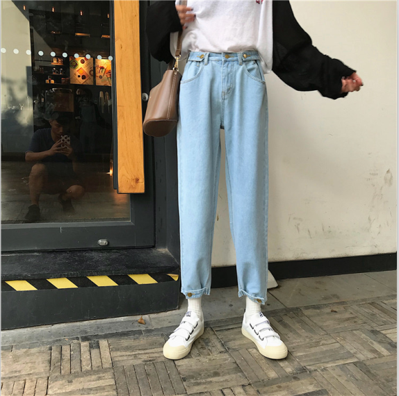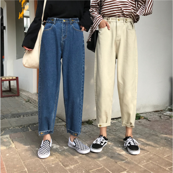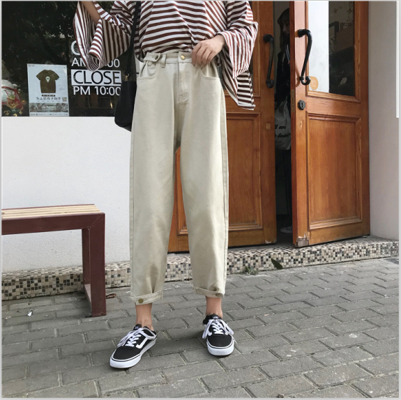 / 秋季女裝韓版寬松褲腳紐扣束腳褲牛仔褲高腰直筒褲九分褲闊腿褲潮