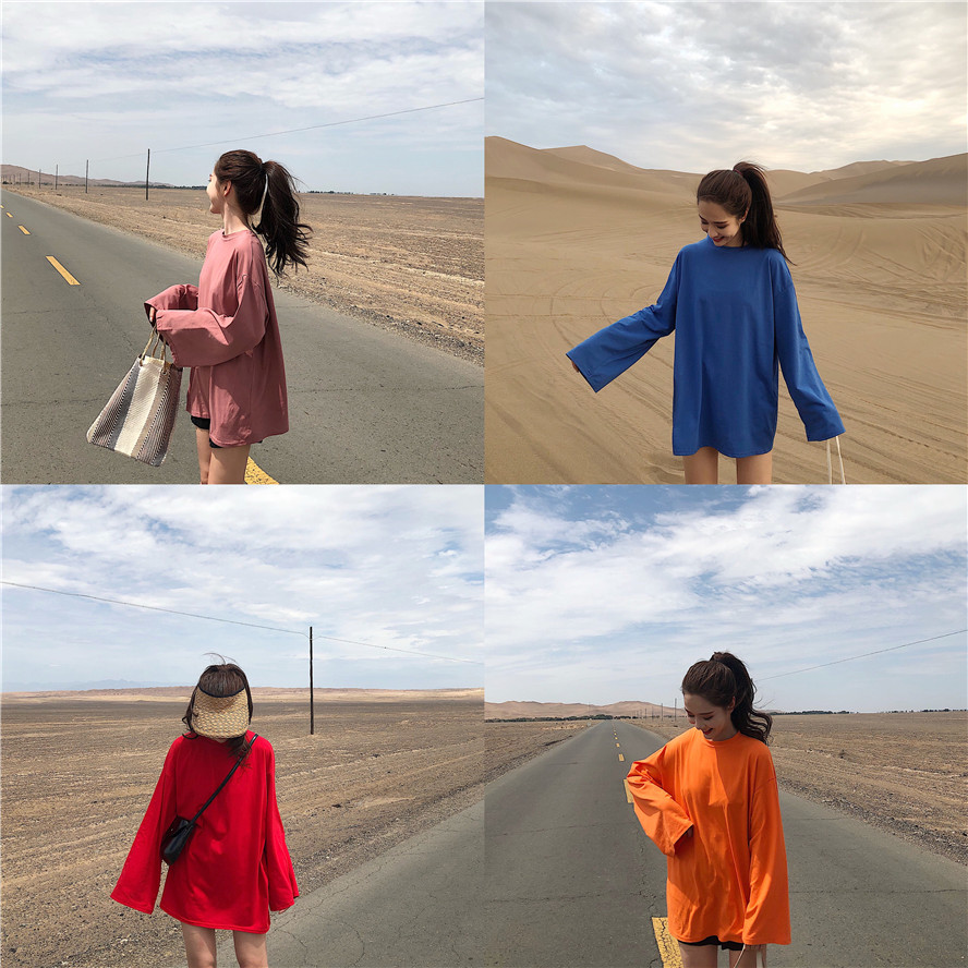 2018韓版寬松百搭純色圓領T恤女中長款長袖上衣小清新學生打底衫