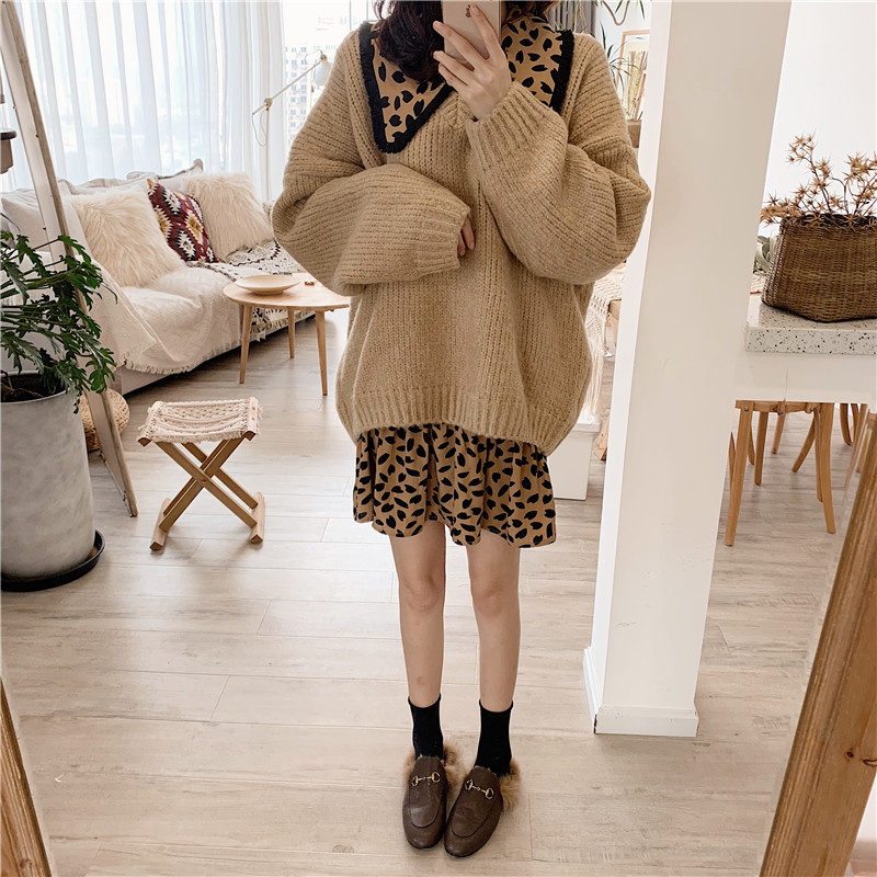 韓版百搭寬松套頭V領長袖加厚毛衣女秋冬2018新款+豹紋打底連衣裙
