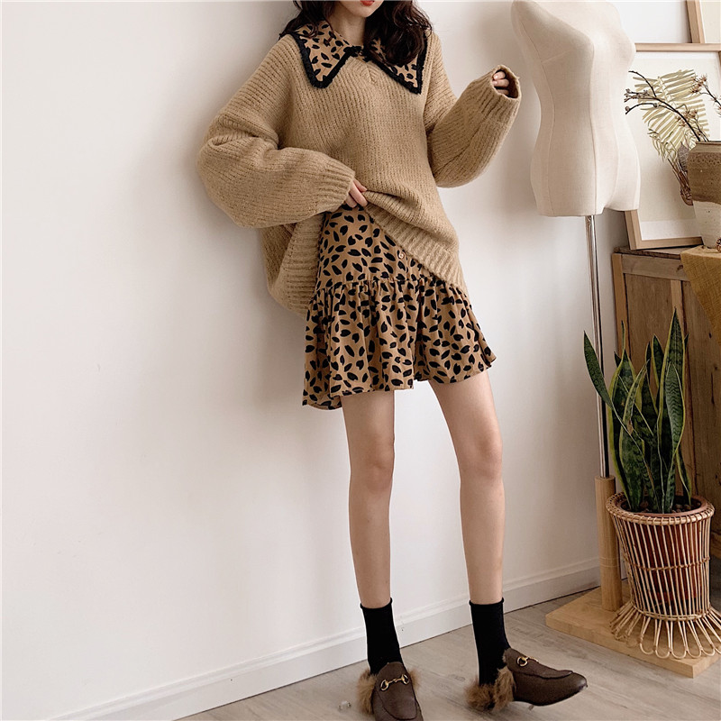秋裝女2018新款套裝chic豹紋長袖毛衣+韓版百搭高腰A字半身裙皮裙