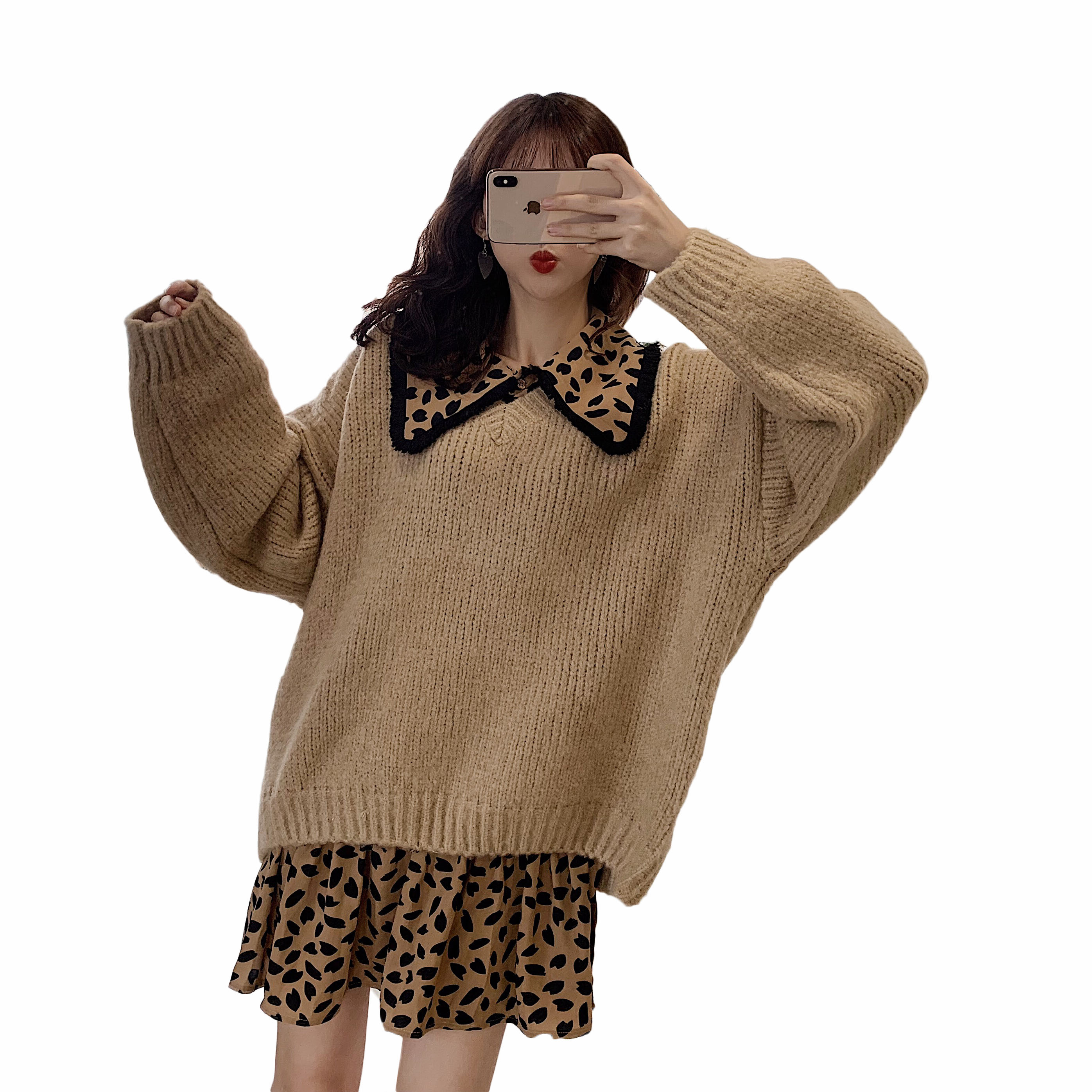 / 韓版百搭寬松套頭V領長袖加厚毛衣女秋冬2018新款+豹紋打底連衣裙