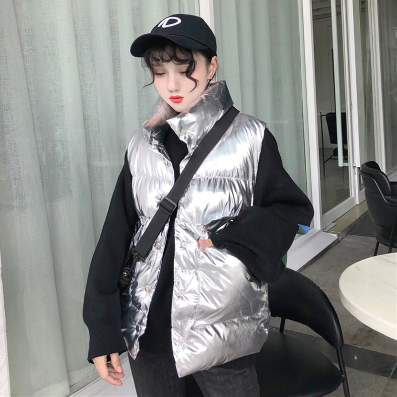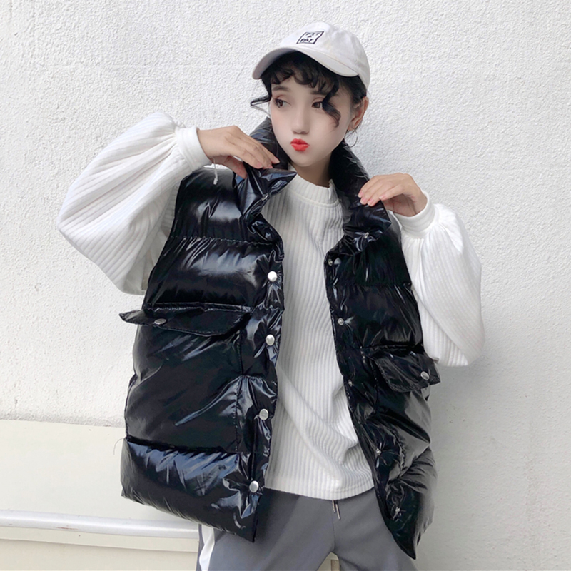 / 原宿中長款立領馬甲秋裝女2018新款韓版學生寬松黑色外套亮面棉襖
