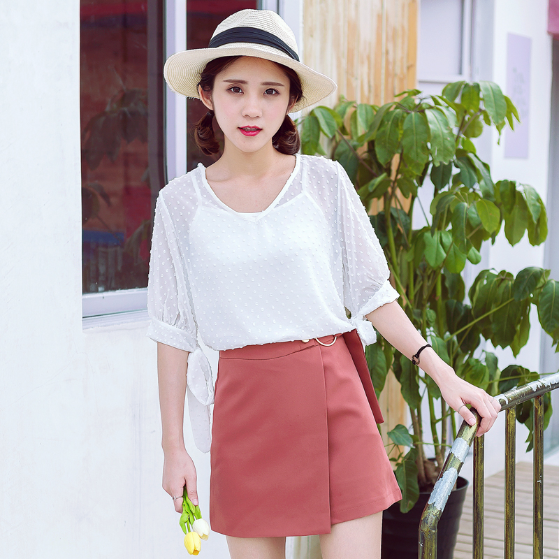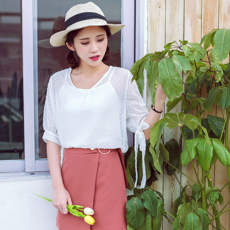V領短袖小吊帶兩件套雪紡衫女夏裝寬松中長款紗網罩衫套裝潮