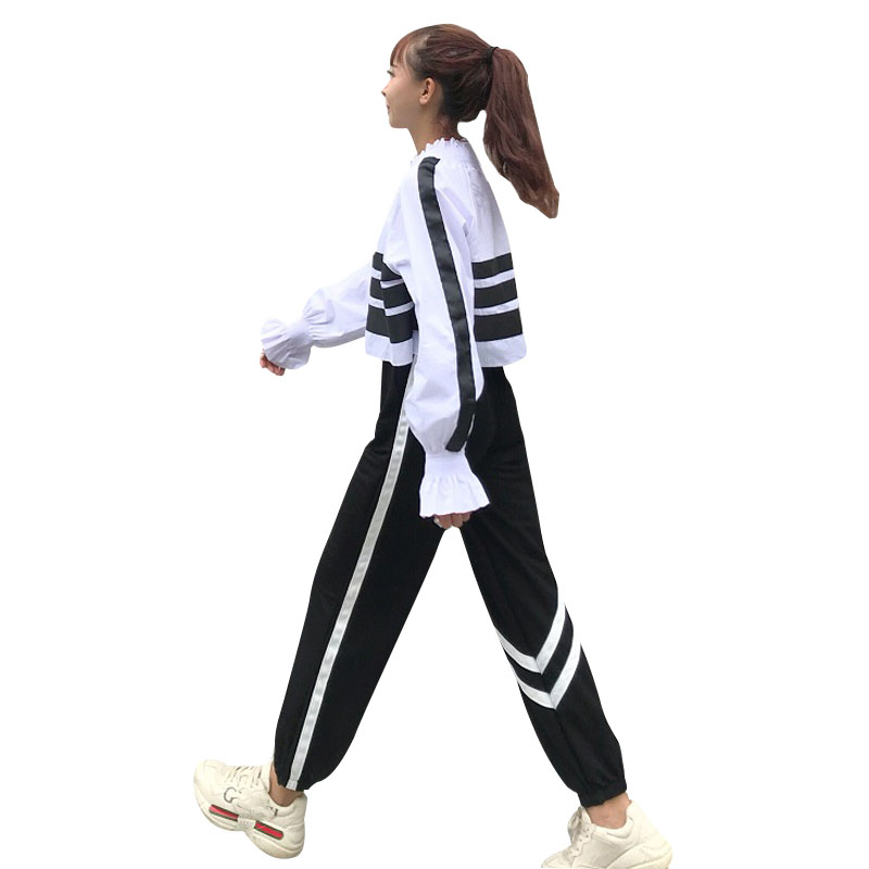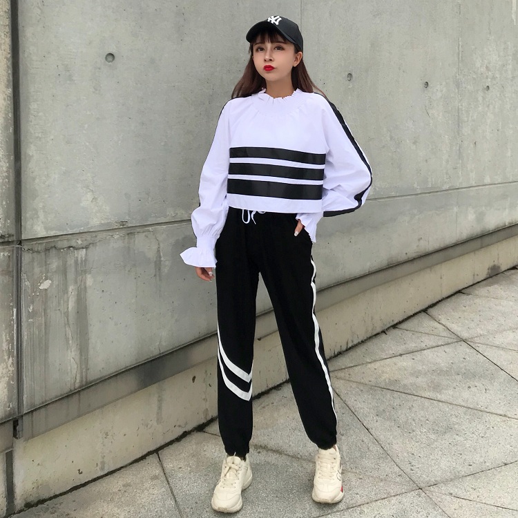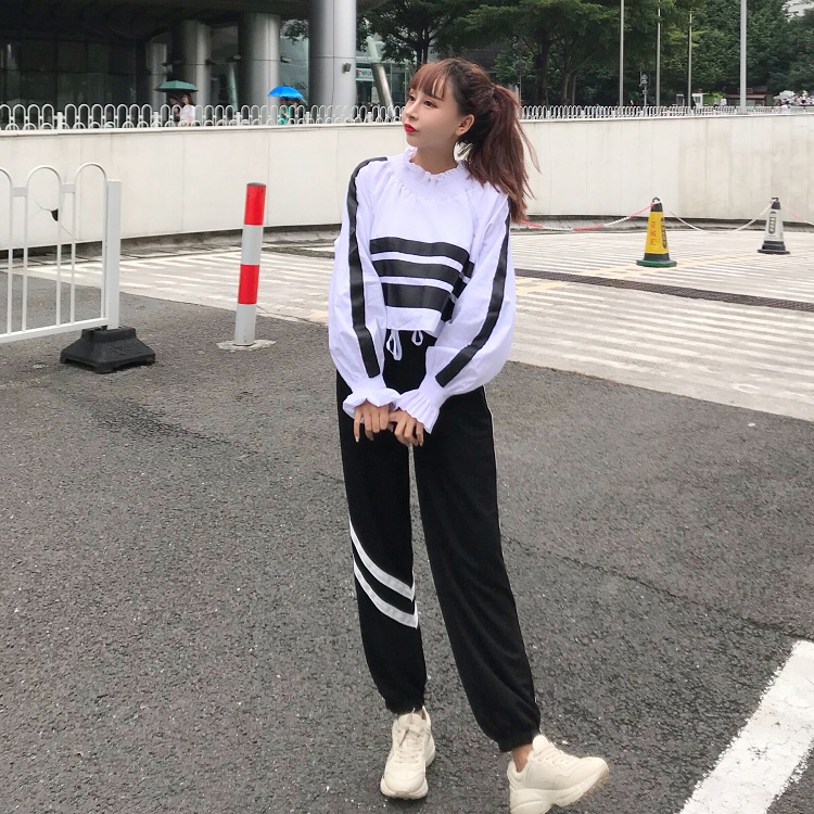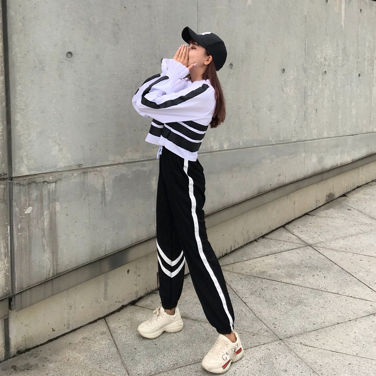 / 韓版時尚休閑套裝秋季寬松短款長袖外套+高腰運動哈倫褲兩件套女