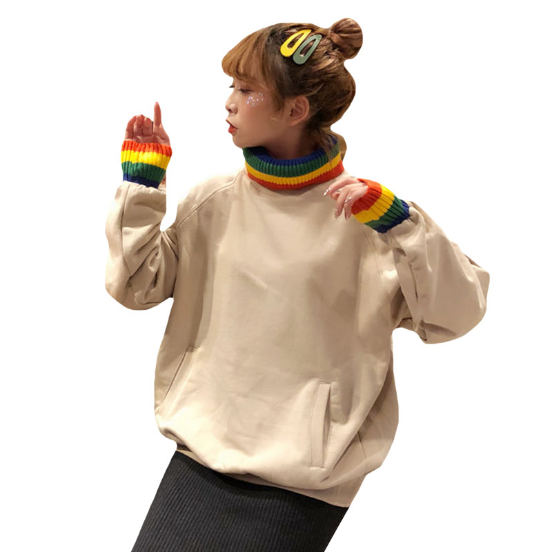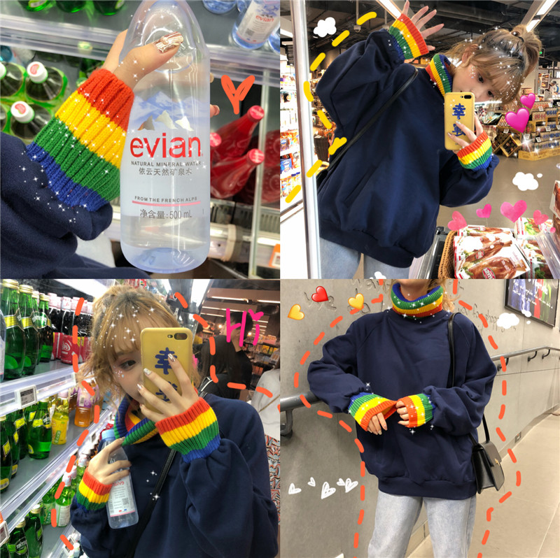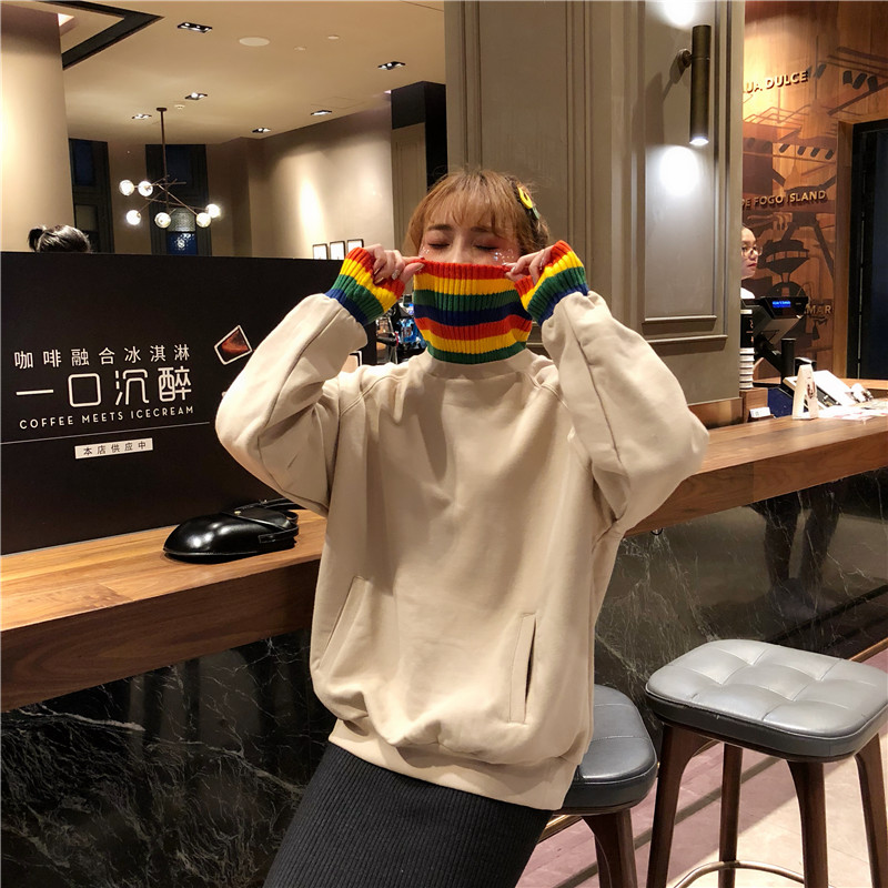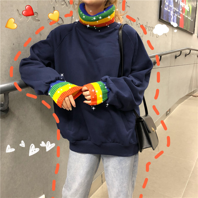 / 秋冬韓版寬松中長款彩虹毛線拼接高領加絨加厚套頭衛衣上衣外套女