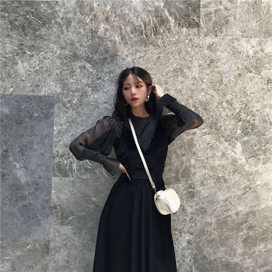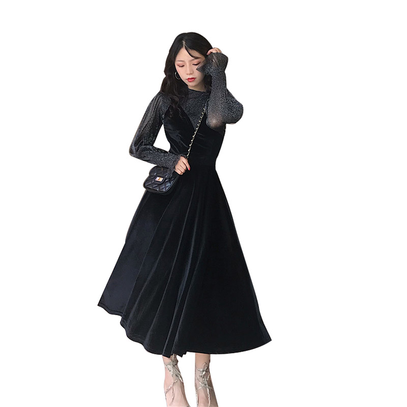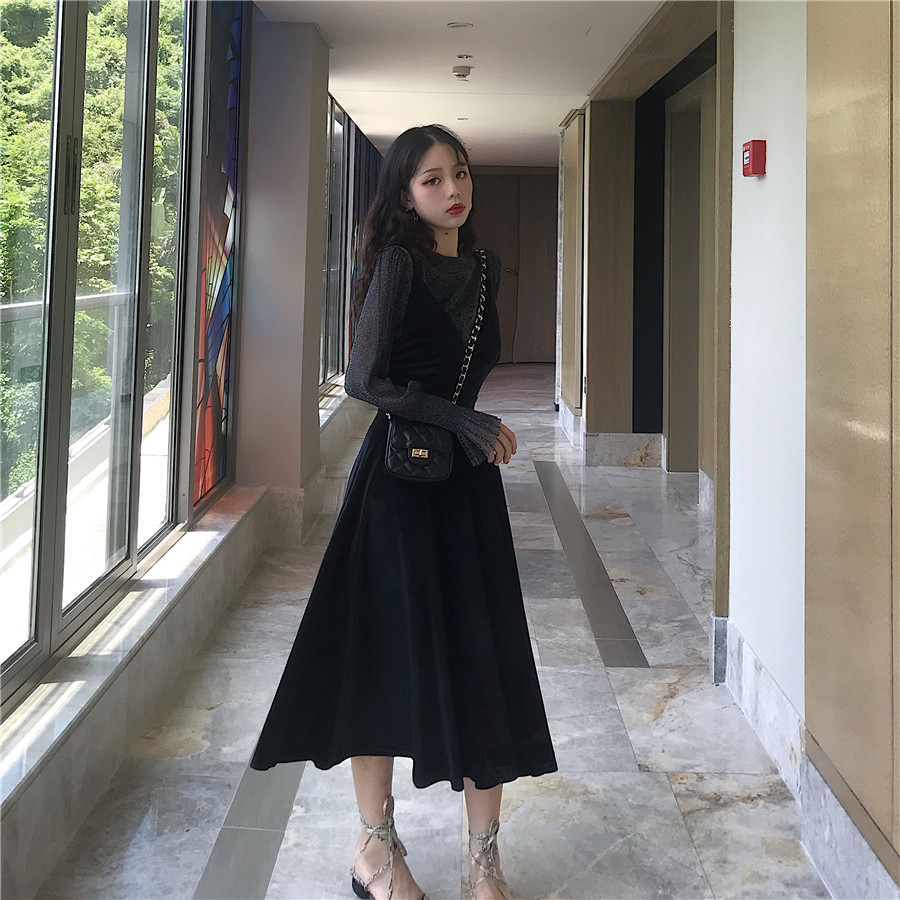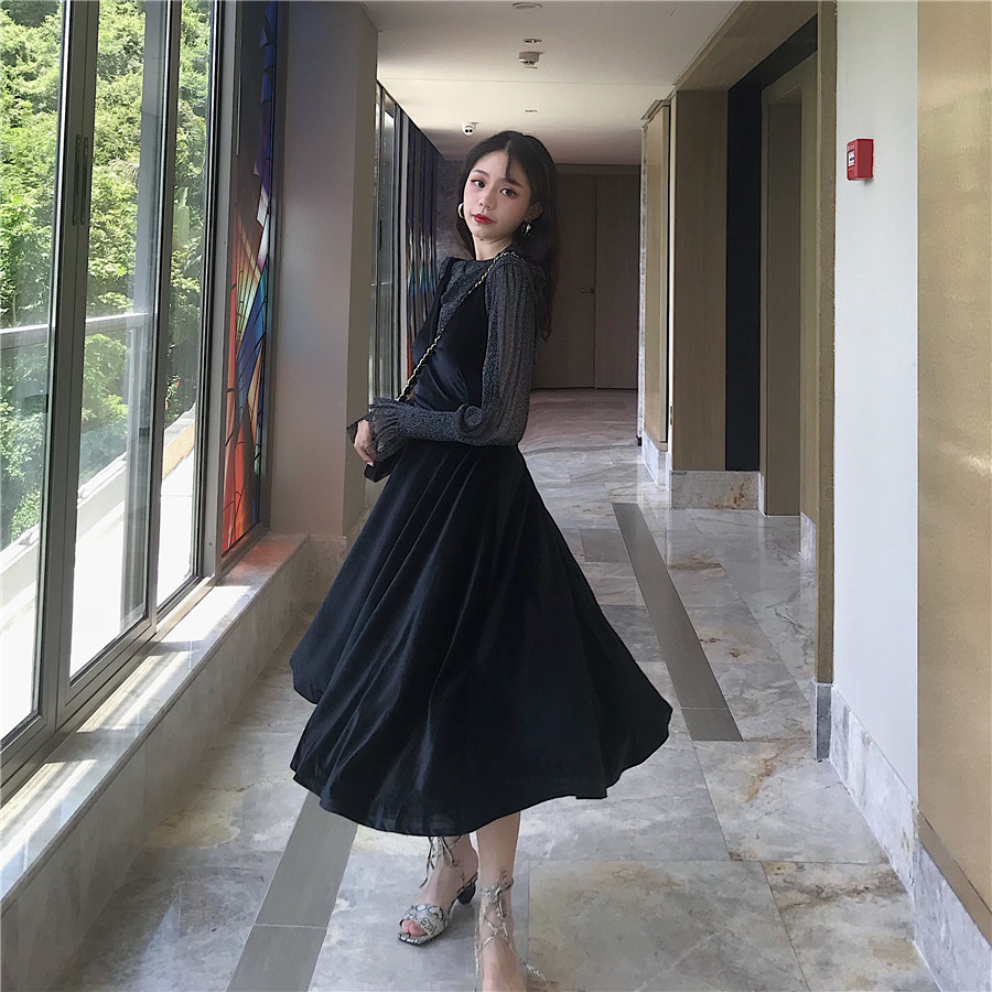 復古韓版溫柔風V領吊帶裙子秋裝女2018新款時尚氣質兩件套連衣裙