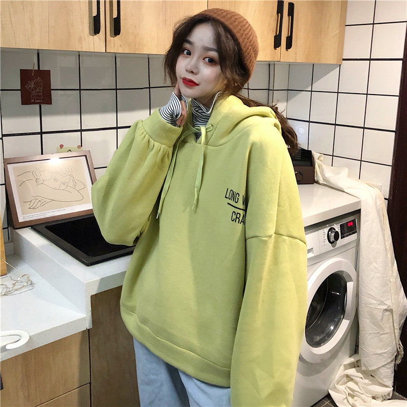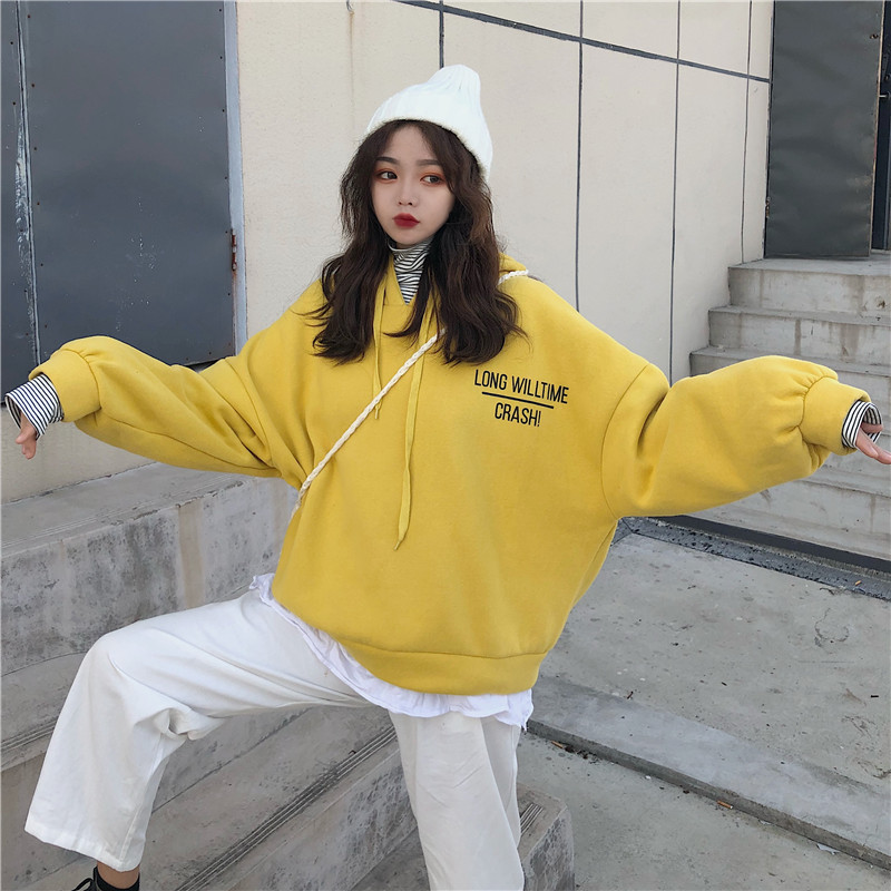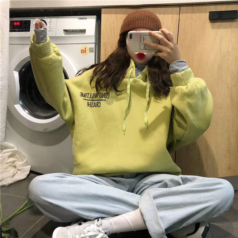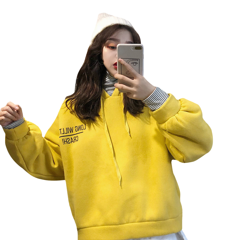 秋冬女裝韓版寬松字母拼接條紋高領加絨加厚連帽套頭衛衣上衣外套