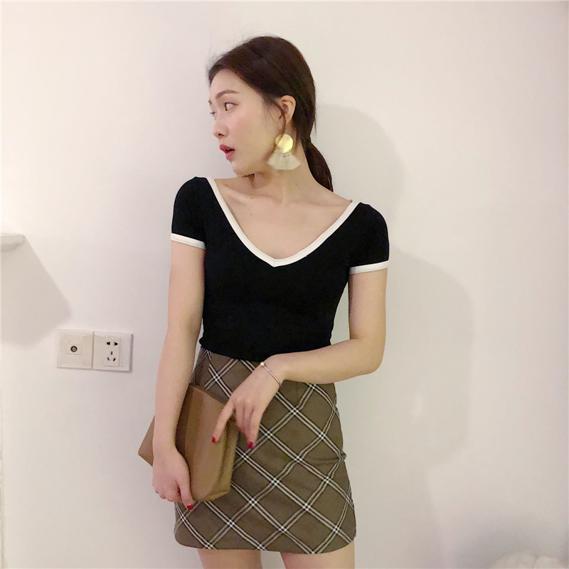 / 夏季新款女裝氣質拼色大V領修身顯瘦學生百搭短袖打底衫T恤上衣
