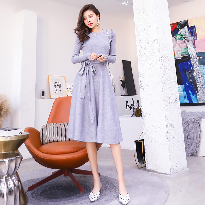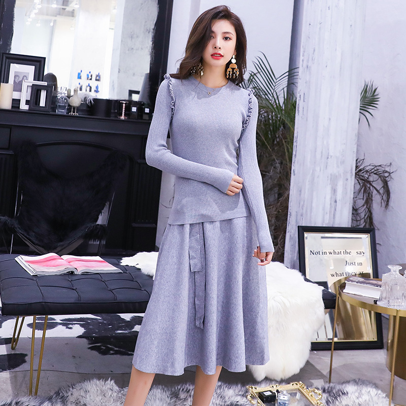2018新款女神早秋套裝連衣裙兩件套秋季女氣質套裙中長款針織時尚
