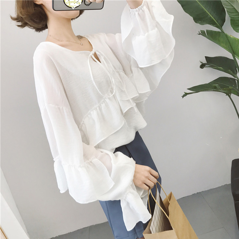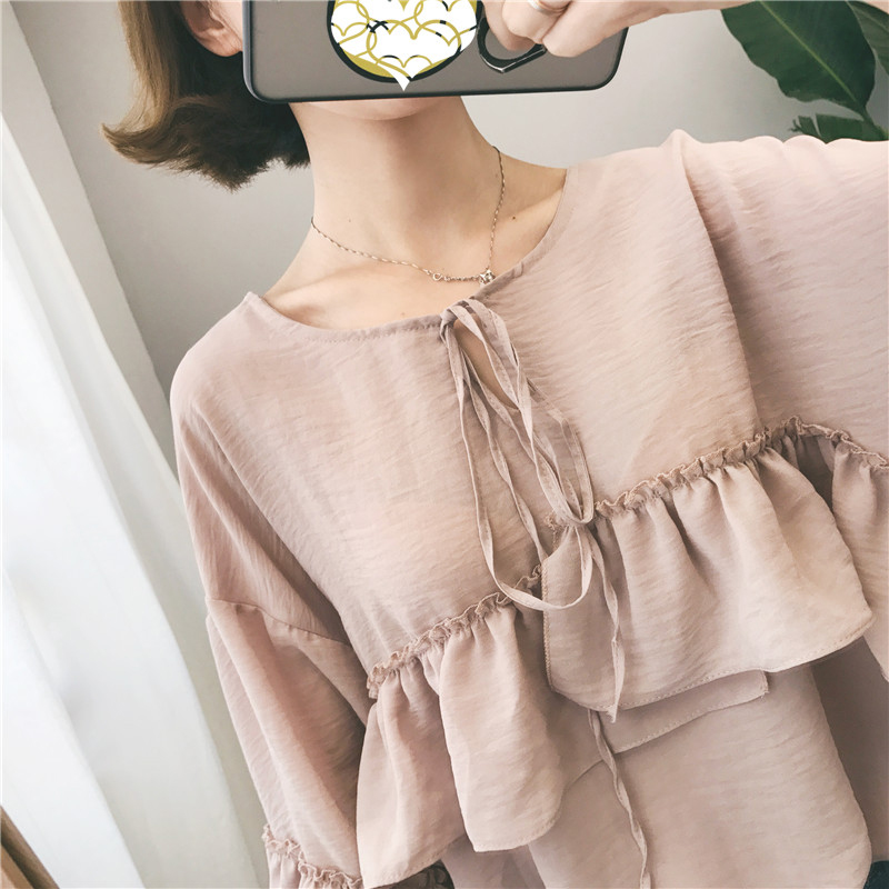 秋裝女2018新款韓版氣質荷葉邊長袖雪紡襯衫時尚洋氣寬松系帶上衣