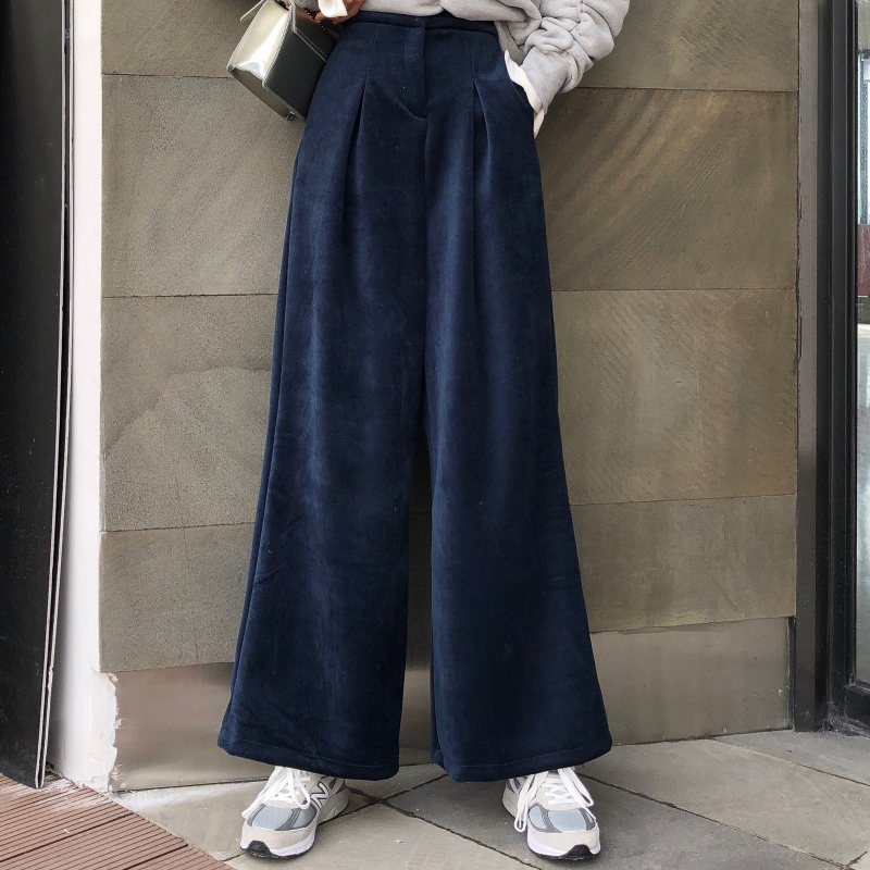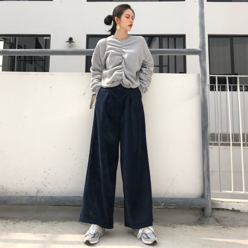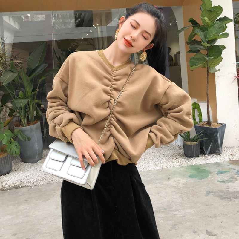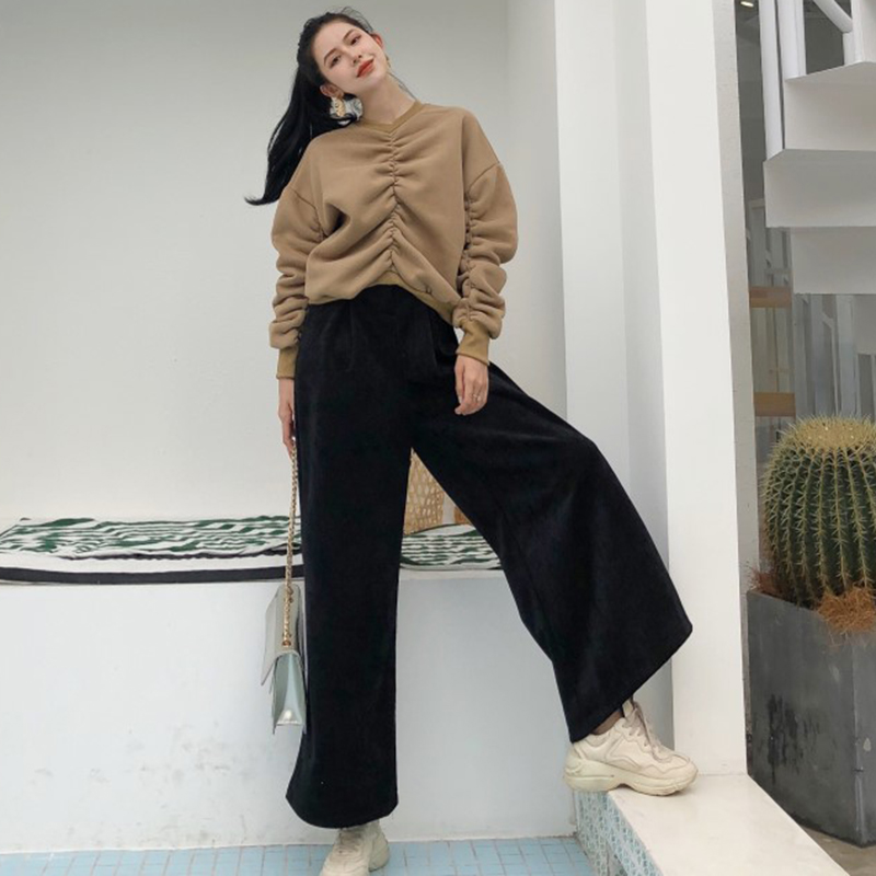 / 御姐套裝女秋冬新款寬松加絨褶皺衛衣外套高腰寬松休閑闊腿長褲子