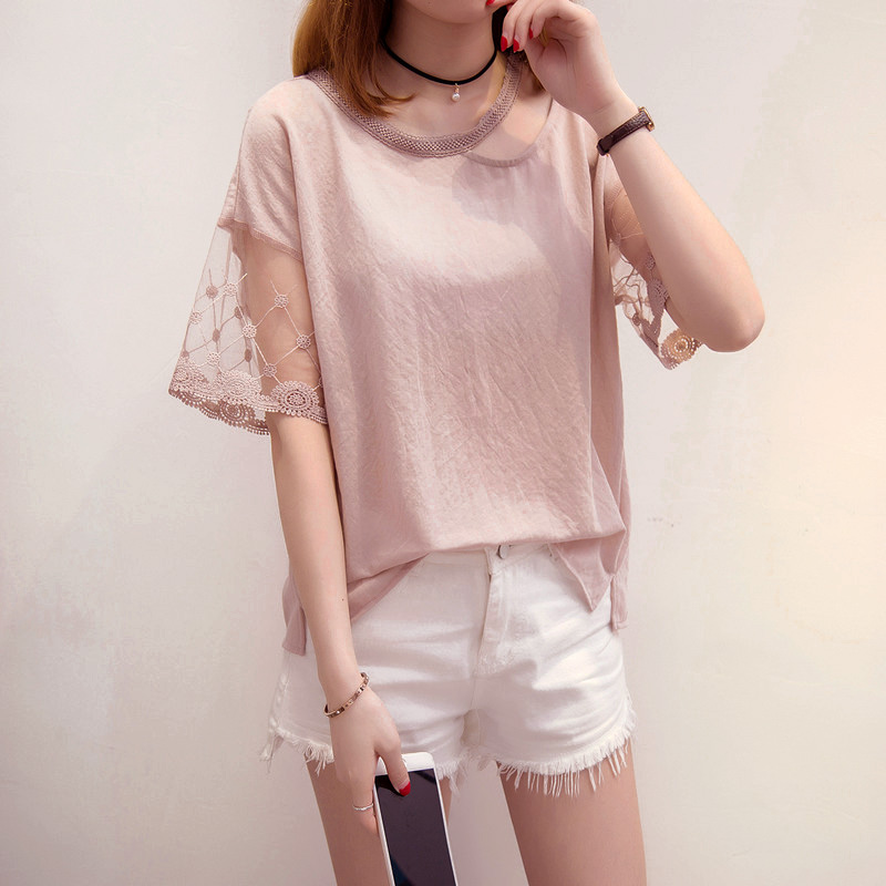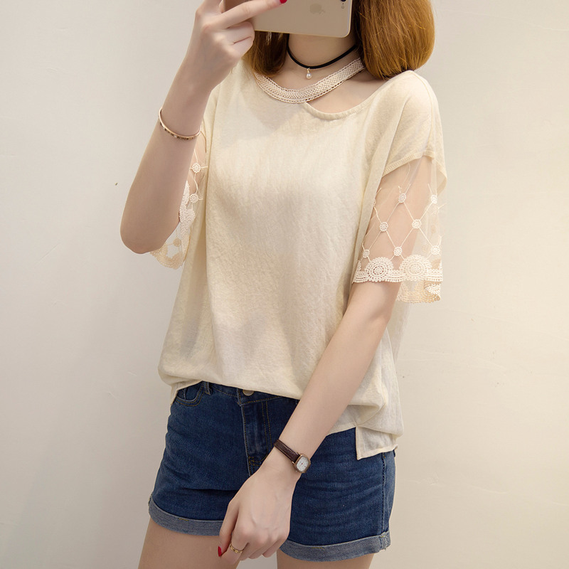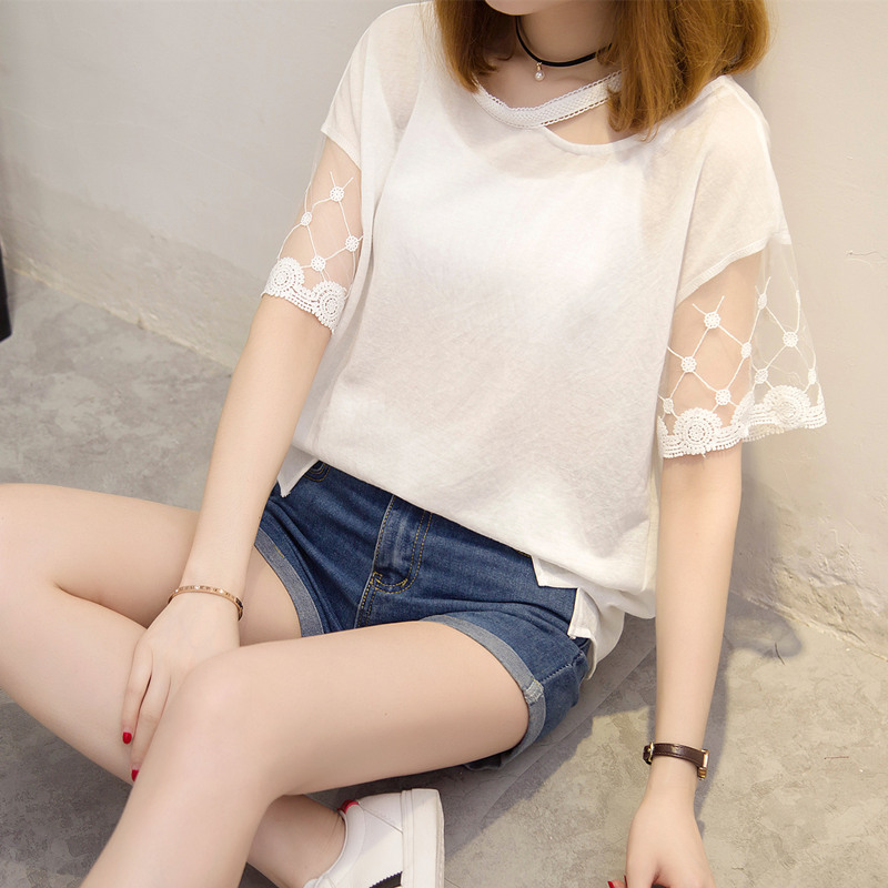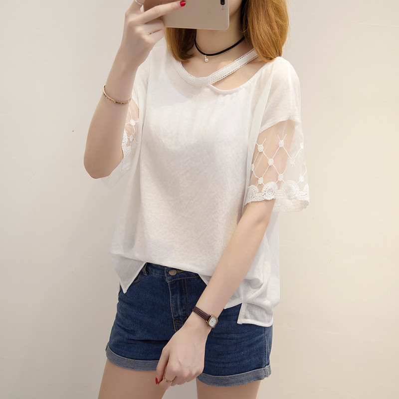 夏裝新款女裝網紗寬松白色t恤女bf風韓版露肩上衣短袖體恤衫