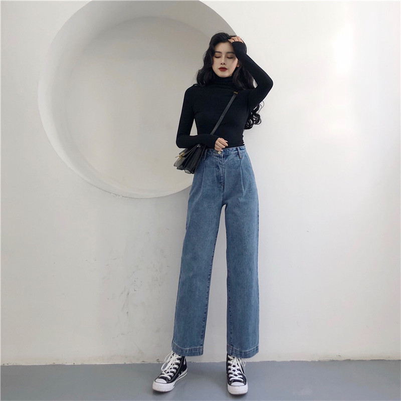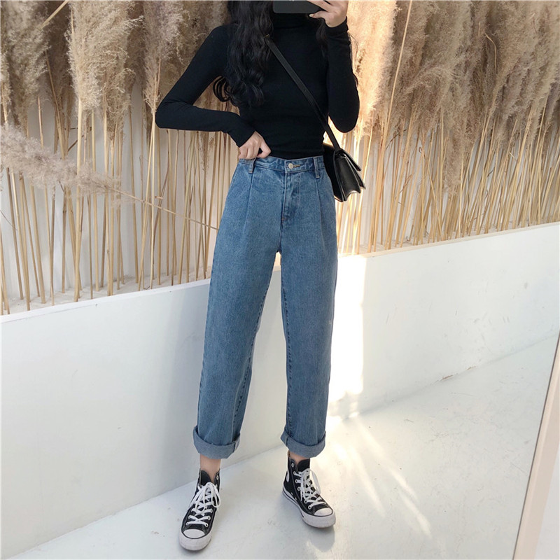 / 復古韓國百搭chic風高腰顯瘦直筒褲牛仔褲女寬松簡約長褲潮可卷邊