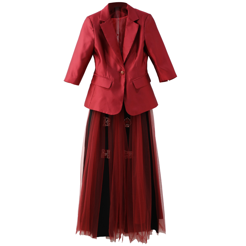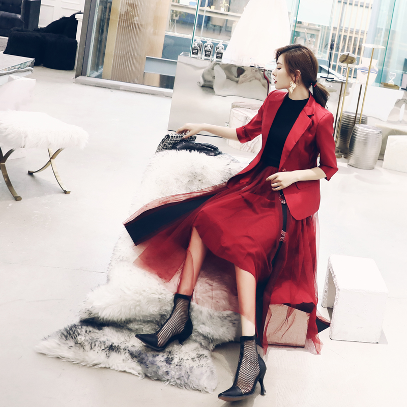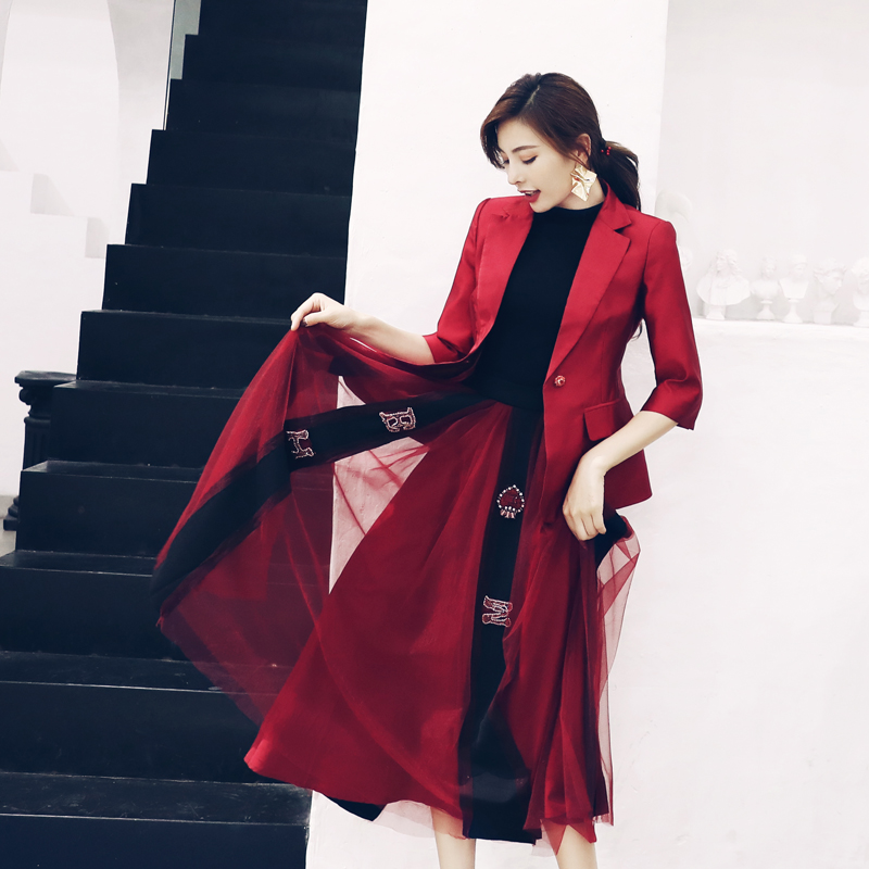 名媛氣質2018秋季新款西服外套紅色小西裝網紗釘鉆半身裙兩件套裝