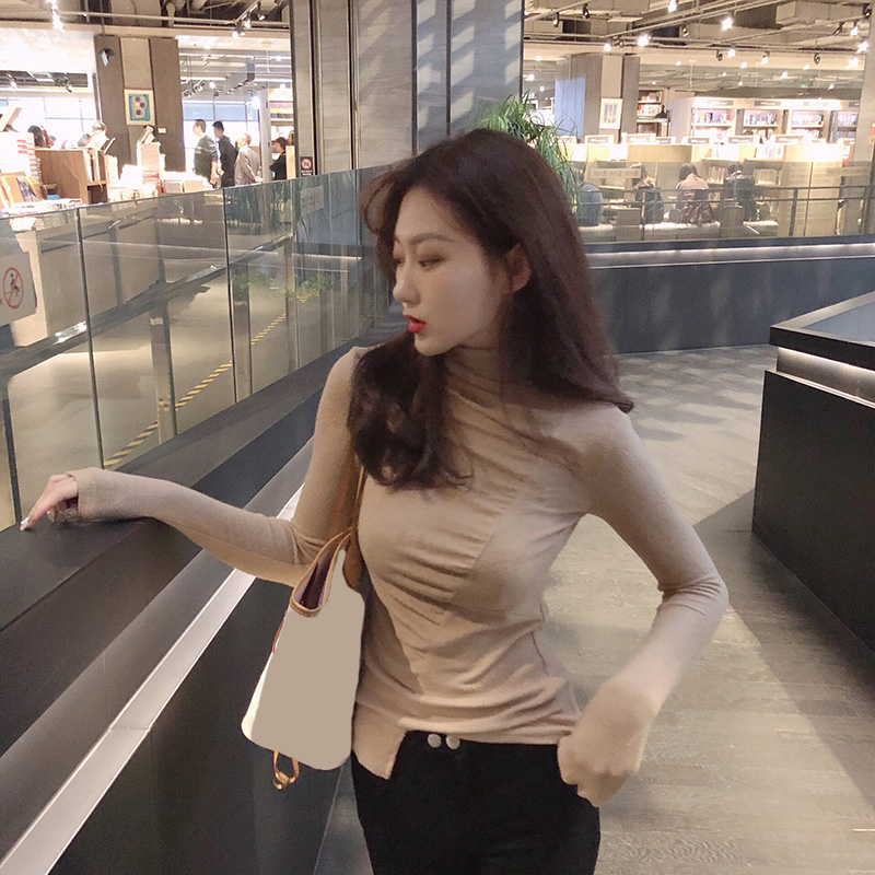 2018秋冬新款韓版修身顯瘦設計感顯瘦高領T恤女不規則打底上衣潮