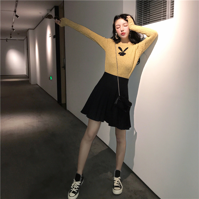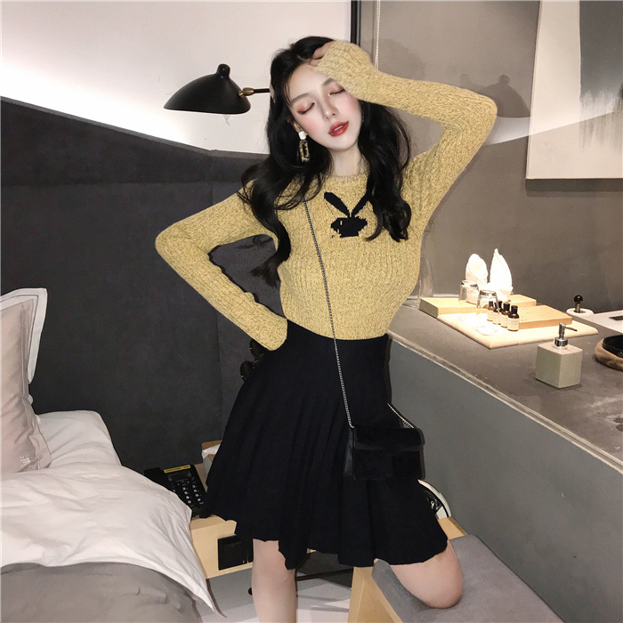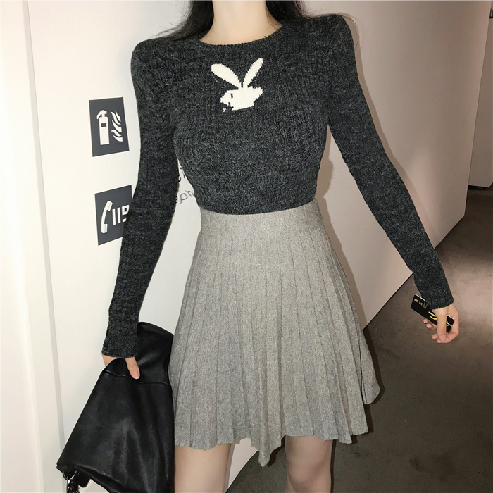 / 女神套裝秋冬新款顯瘦修身長袖毛線針織衫+壓折高腰針織半身裙女