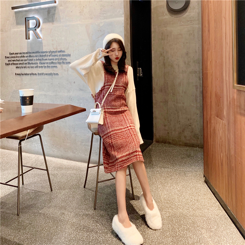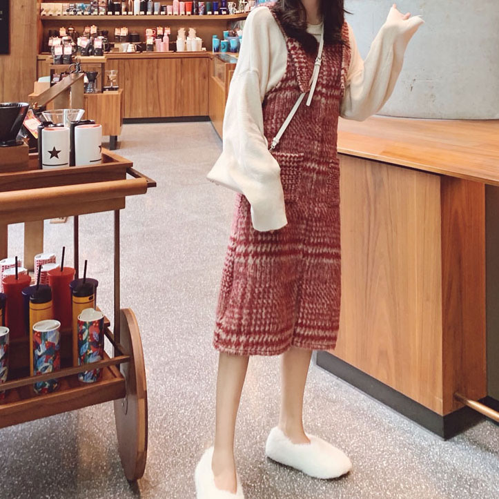 韓版時尚套裝慵懶寬松套頭開叉針織衫+氣質中長款格紋毛呢背帶裙