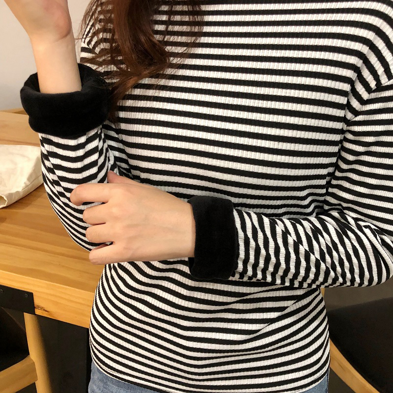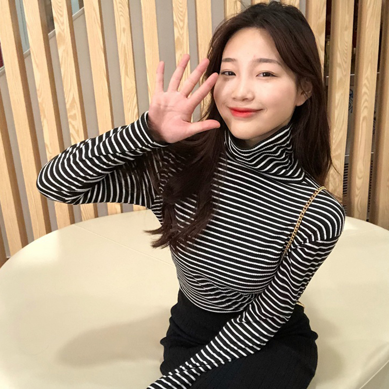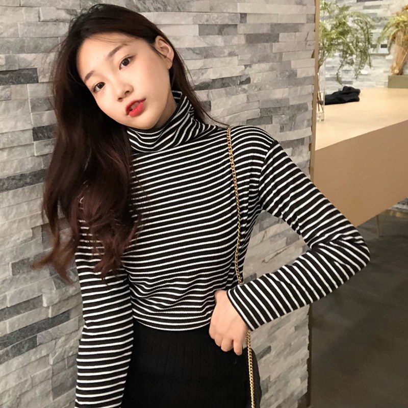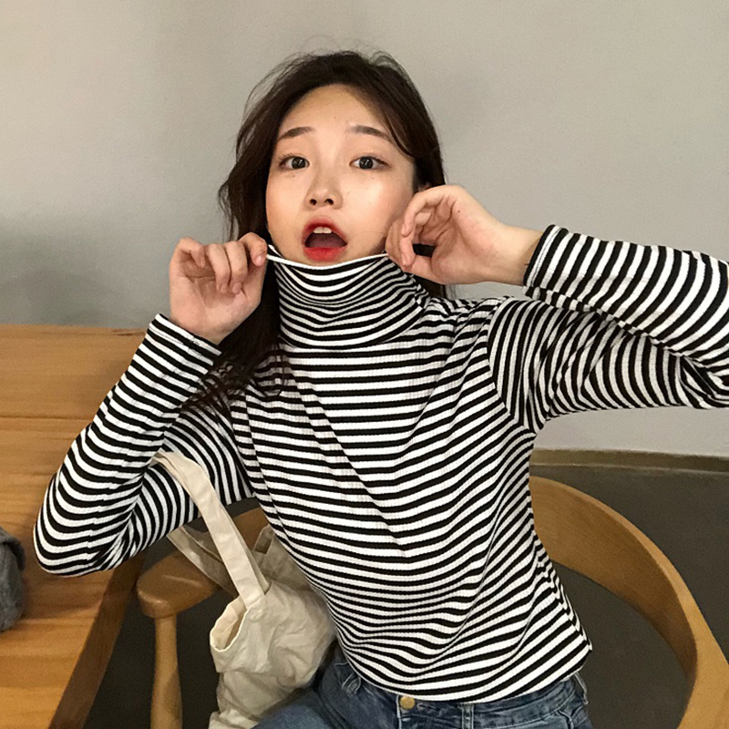 秋冬女裝2018新款韓版條紋高領外穿打底衫氣質修身長袖T恤上衣潮