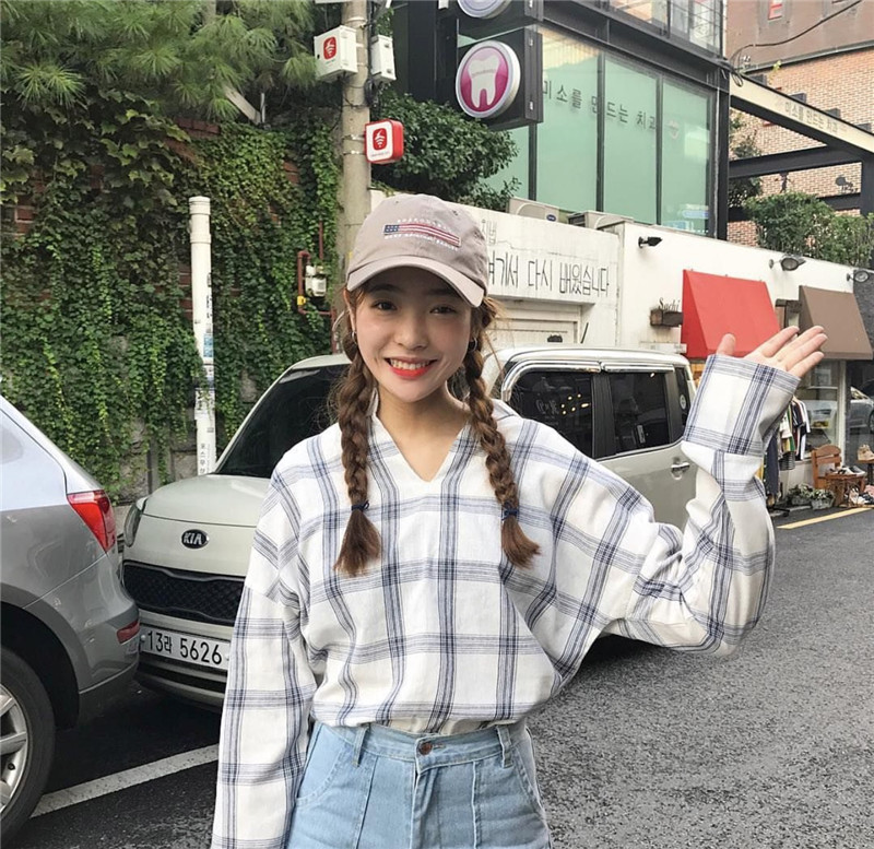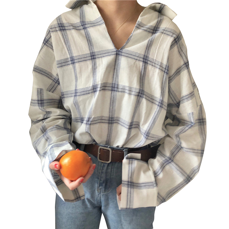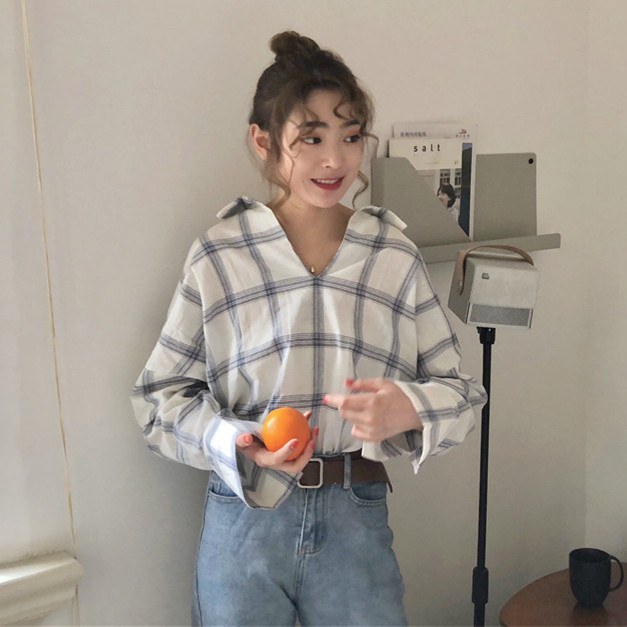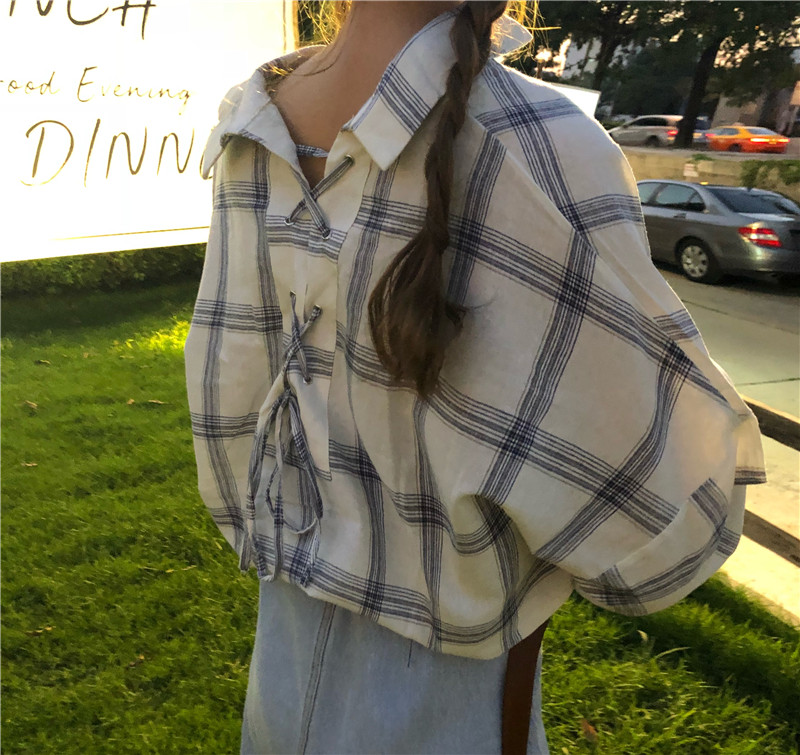 / 秋裝女裝韓版寬松個性后背小心機系帶格子襯衫長袖打底衫襯衣上衣