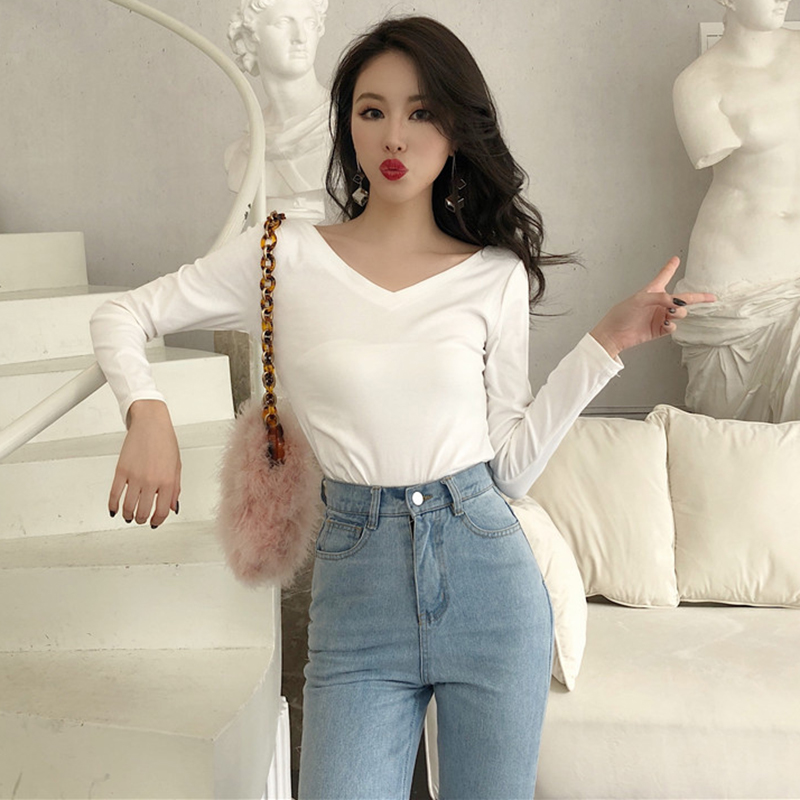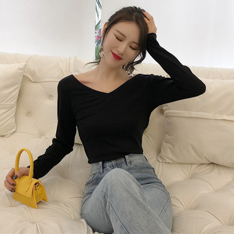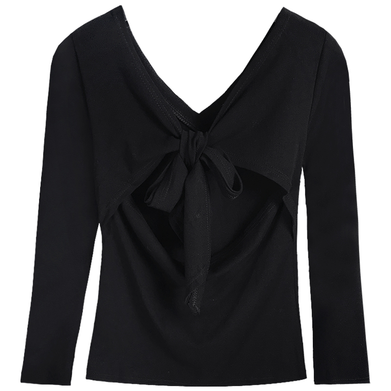 / 心機露背蝴蝶結V領上衣秋裝女2018新款修身長袖T恤短款白色打底衫