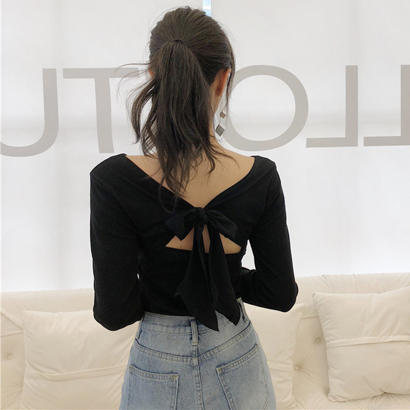 心機露背蝴蝶結V領上衣秋裝女2018新款修身長袖T恤短款白色打底衫