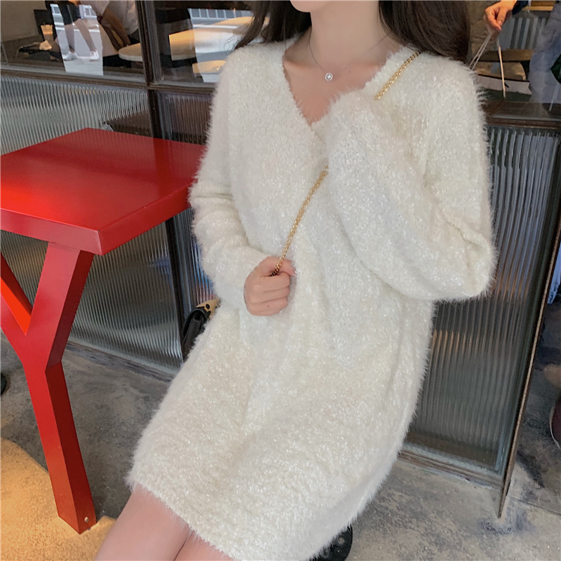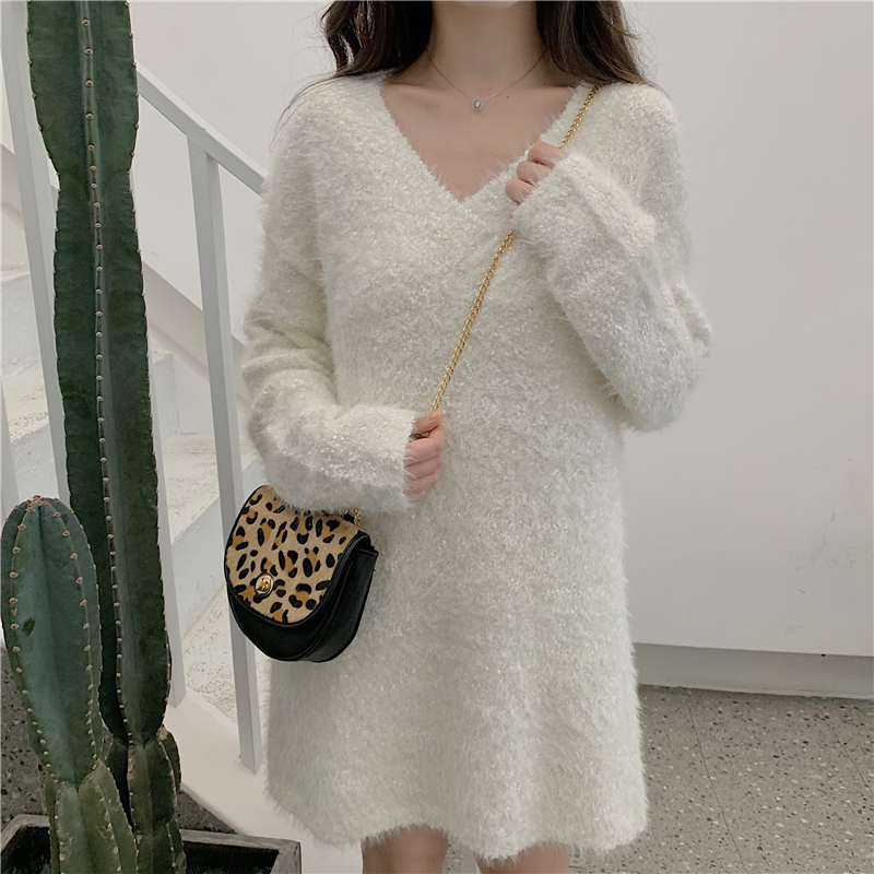 港味復古慵懶風套頭毛衣女2018新款秋冬V領寬松長袖毛衣連衣裙女