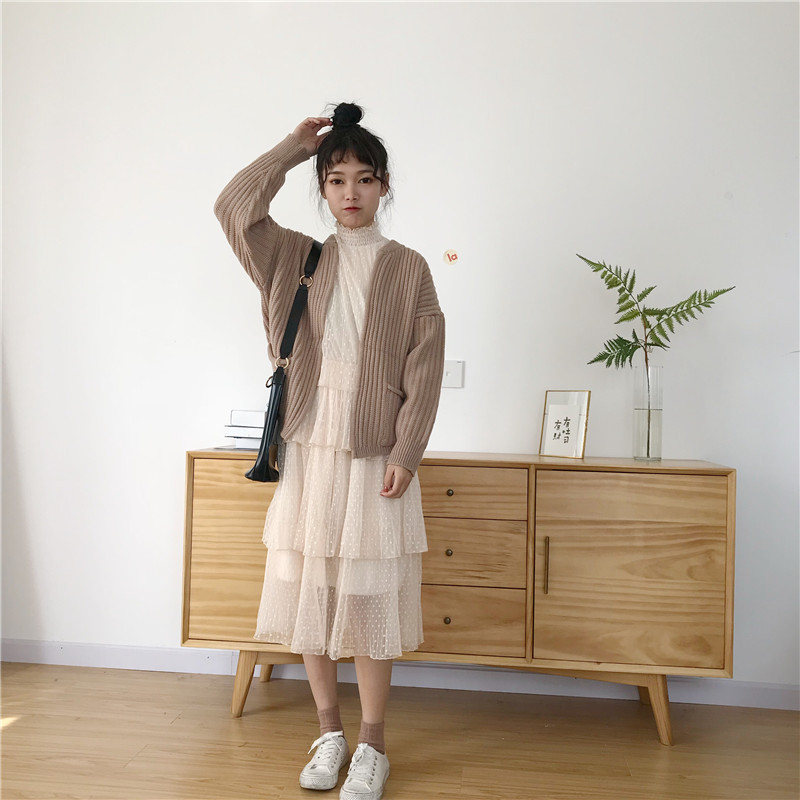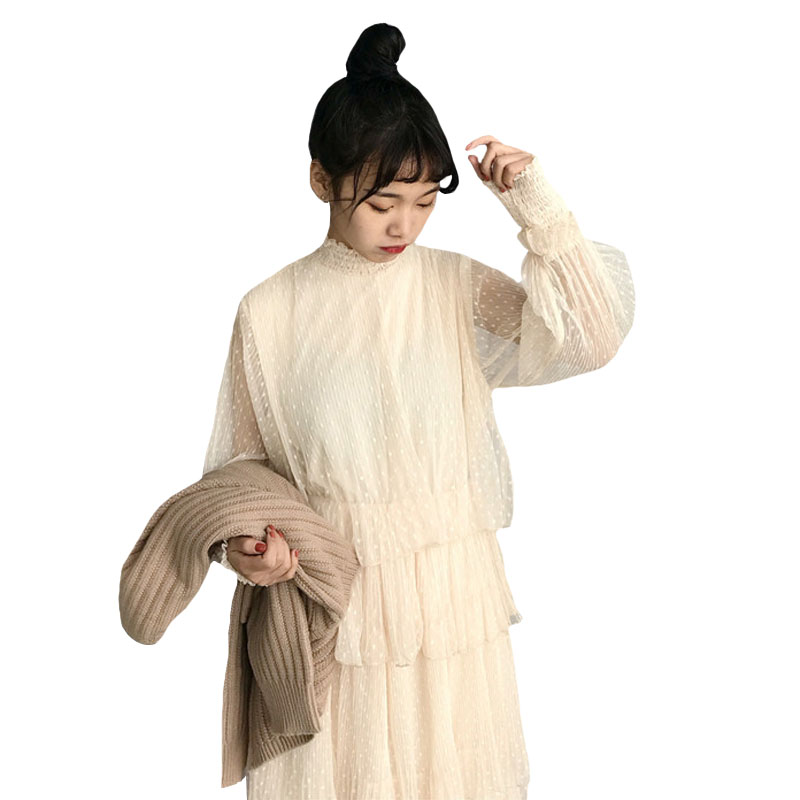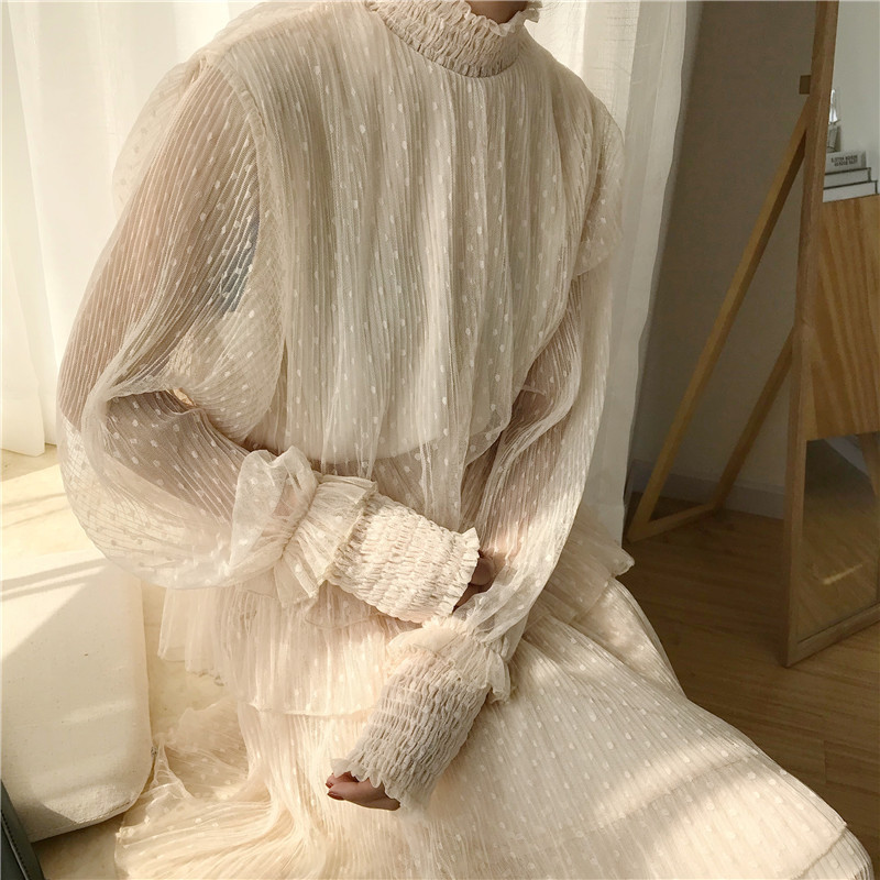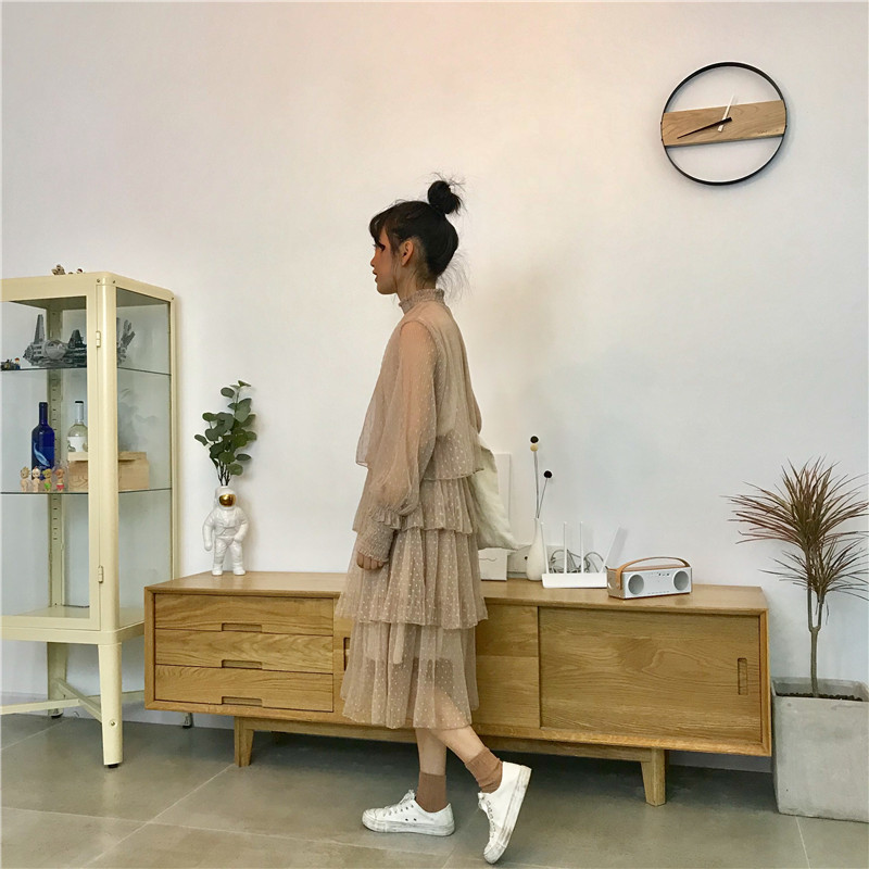 / 秋季女裝韓版中長款甜美氣質花邊蕾絲網紗長袖寬松顯瘦連衣裙長裙
