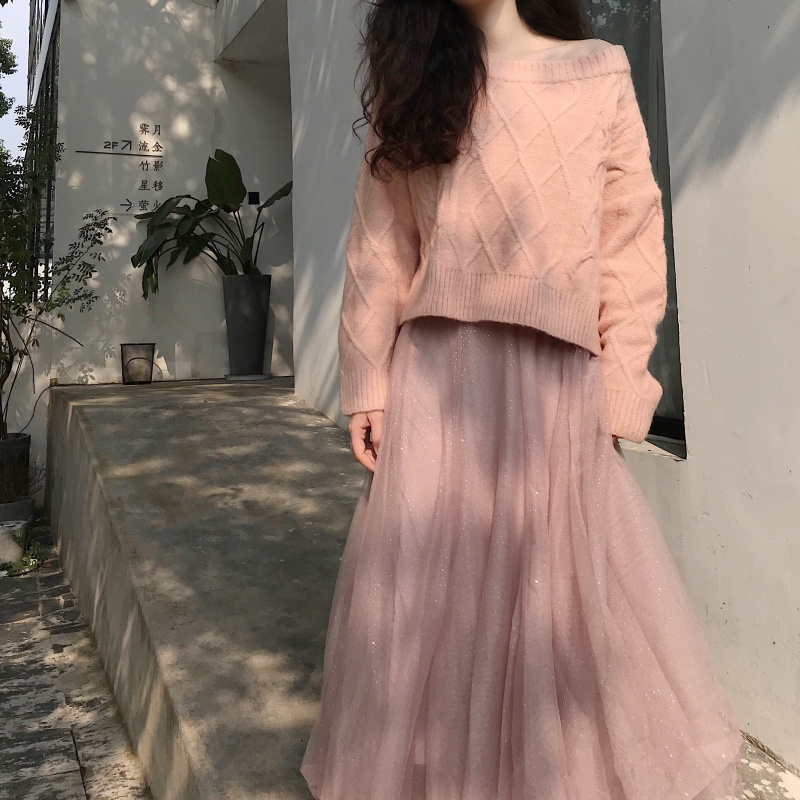 / 2018秋冬季新款寬松圓領套頭菱形針織毛衣+高腰中長款星星網紗裙
