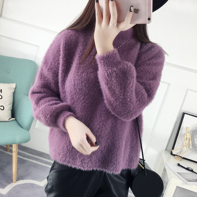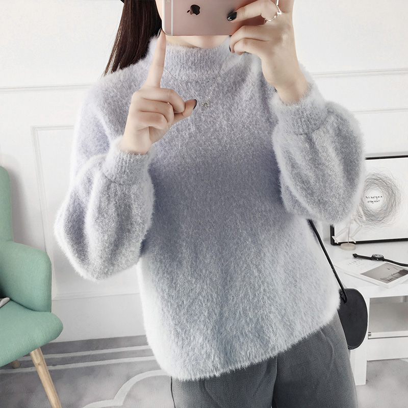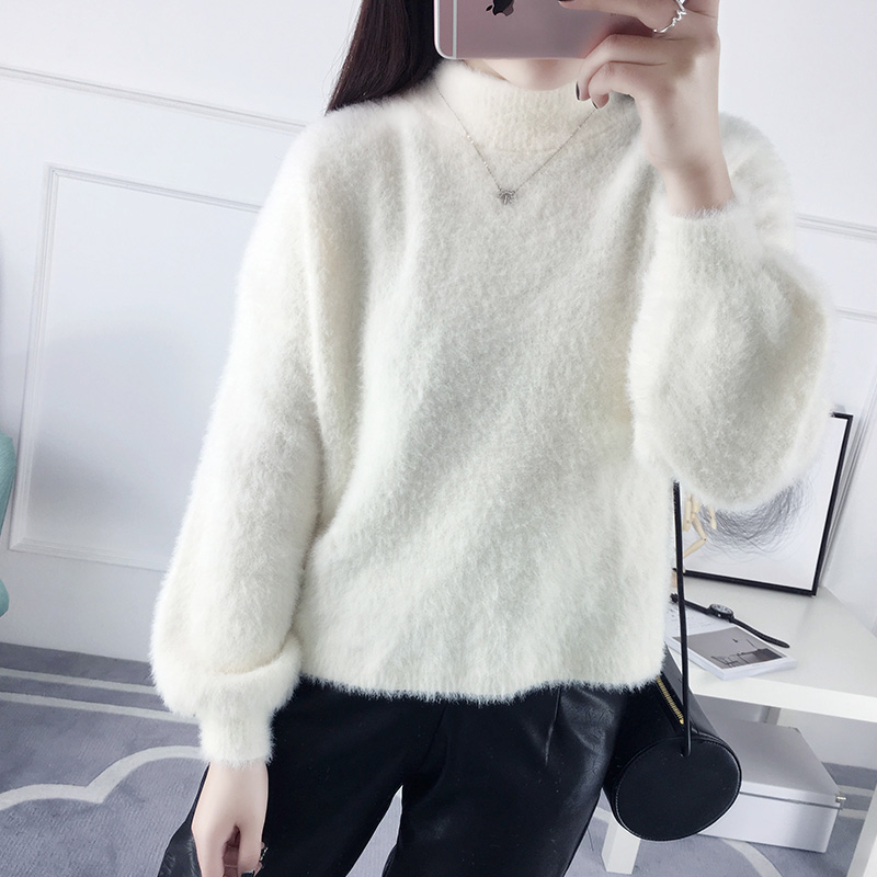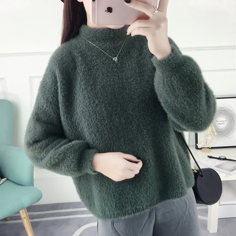 秋冬中高領針織打底衫純色寬松加厚套頭圓領毛衣女短款
