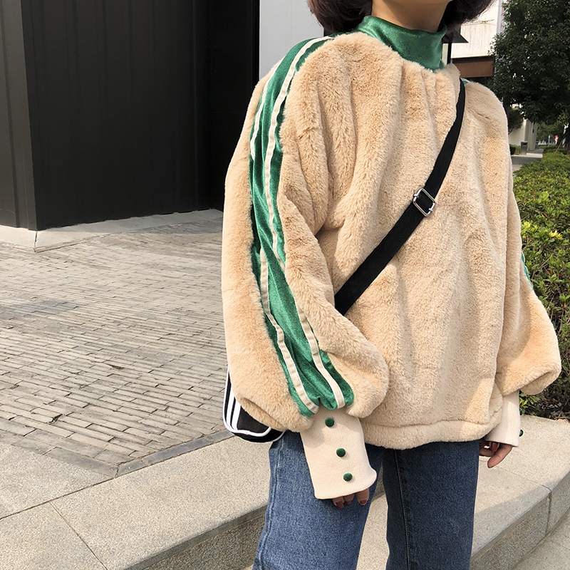 / 秋冬韓版寬松柔軟毛毛拼接絨條紋加厚保暖套頭超火衛衣上衣外套女